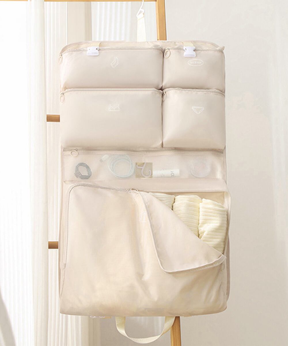 フック付きで、ホテルの部屋やクローゼットのバーに簡単に吊り下げて使用可能。スペースを節約しながら、すっきりと収納を実現。