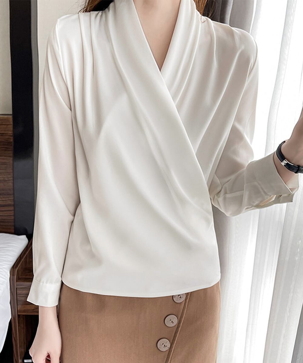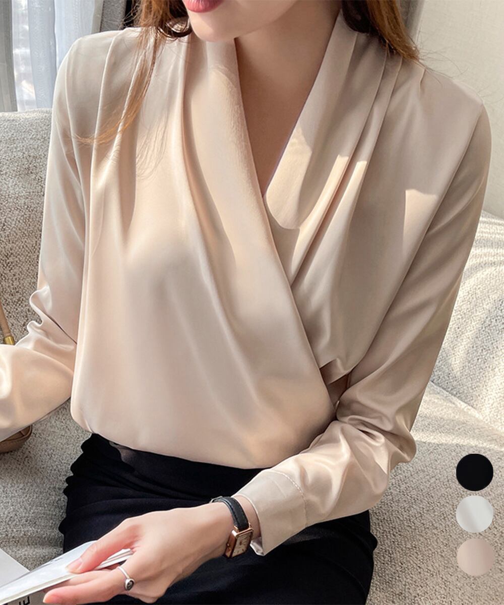 エレガントで洗練されたデザインのシルク風シャツブラウス