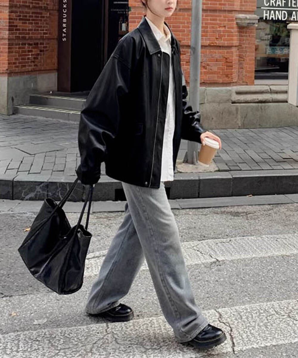 しっかりとした生地感が特徴のフェイクレザージャケット。