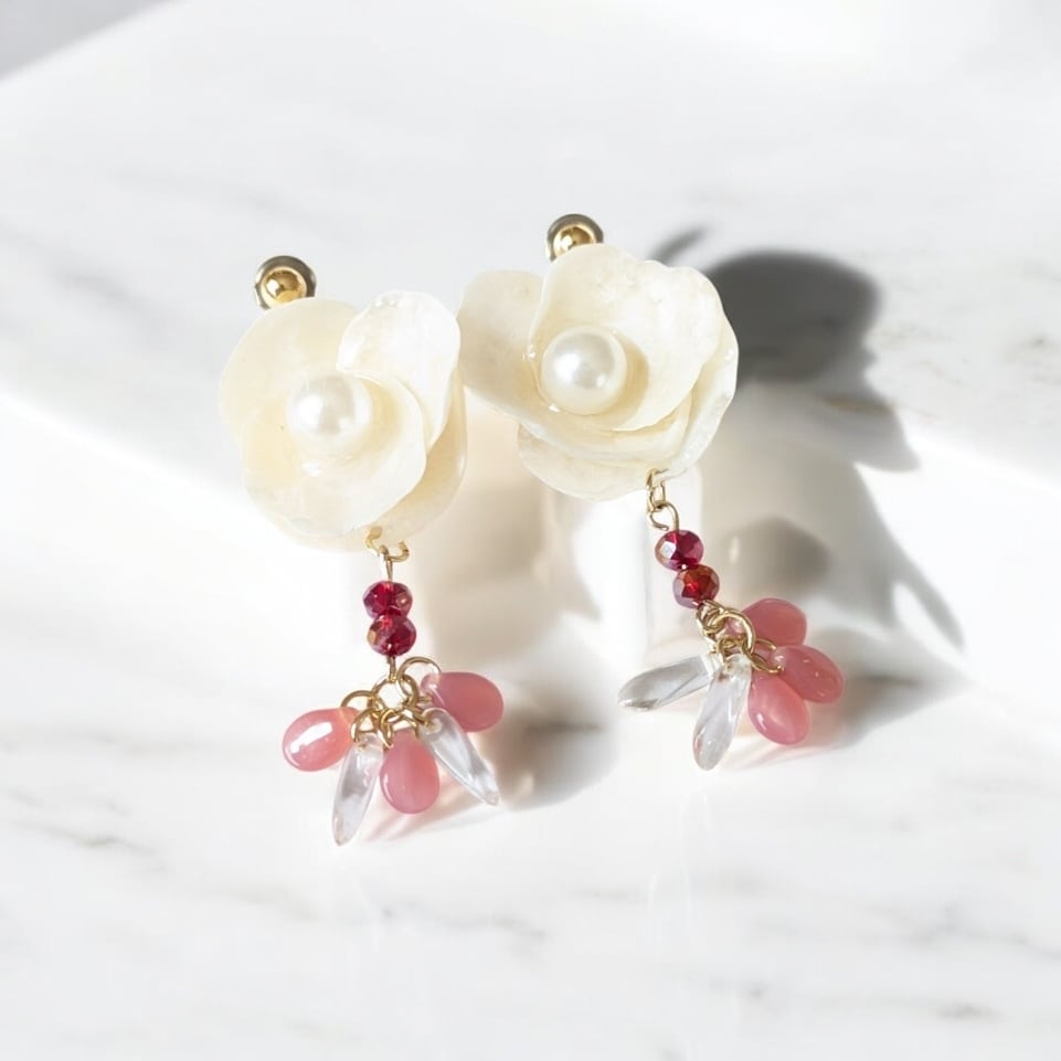 貝殻がまるで花びらのように重なり、ピンクのビーズが軽やかに揺れるデザイン。これからの春の装いにぴったりのアイテムです♡