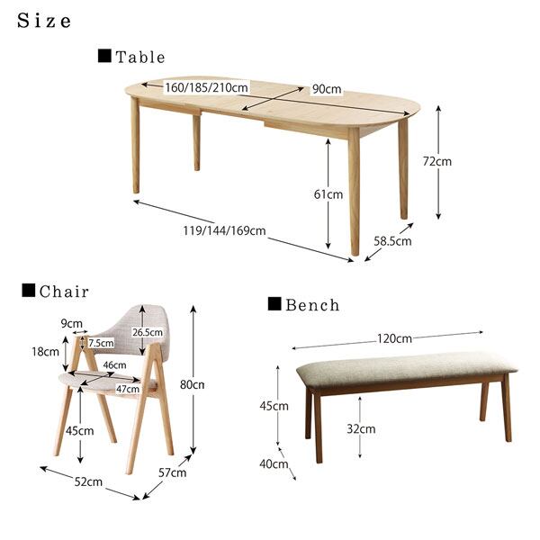 ダイニング4点セット(テーブル+チェア2脚+ベンチ1脚) W160-210
