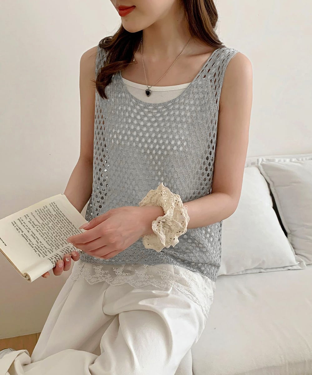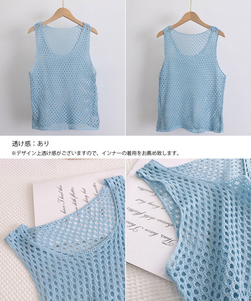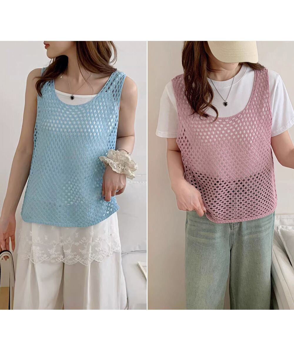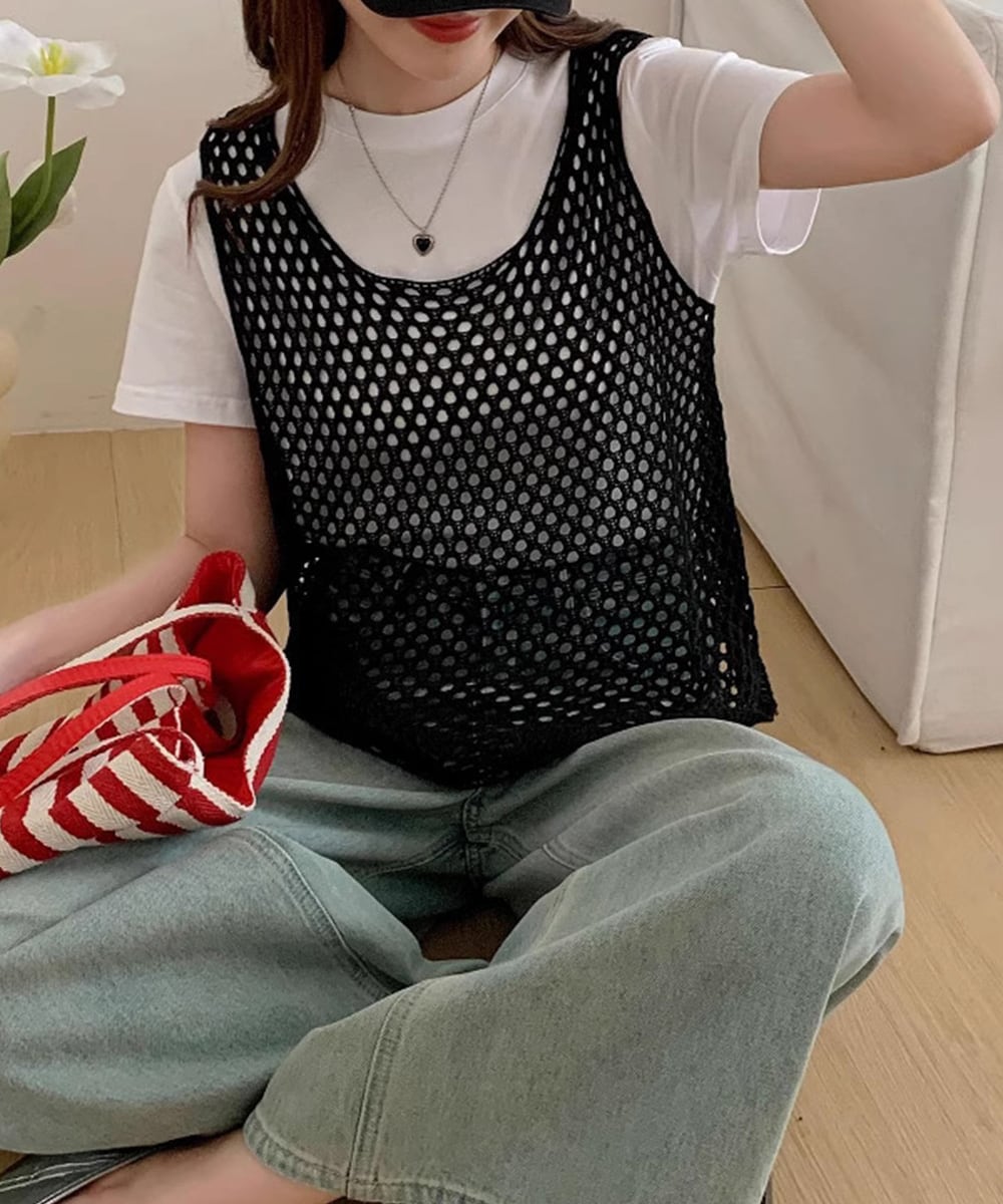 レディース メッシュ編み サマーニット ノースリーブ 薄手タンクニット 涼しげ レイヤードベスト カジュアル チョッキ春無地ニットチョッキ 韓国風ベストお洒落 ベーシック夏服 黒透かし編みが涼しげな印象を与えるサマーニットベスト