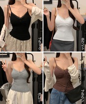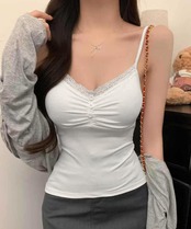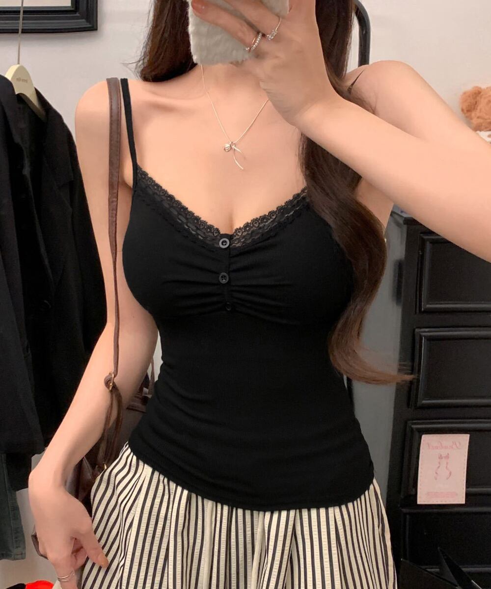 胸元のレースが可愛らしいデザインで、インナーとして取り入れるだけでフェミニンな印象に