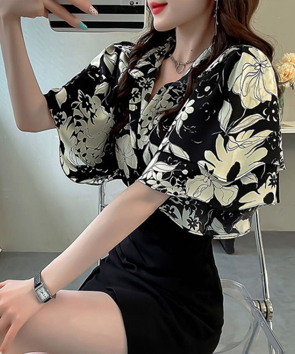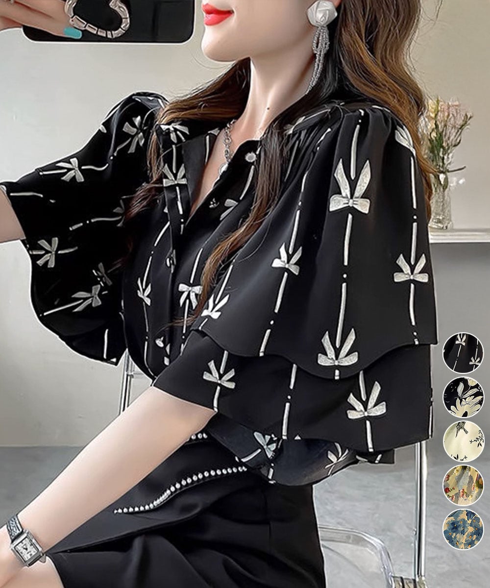 レディース ゆったり シャツブラウス 着やせ 花柄シャツ ドレープ袖 ボタニカル柄フリルブラウス 大人女性抜け感 韓国風おしゃれ ブラウス ボリューム袖シャツ 体型カバートップス二重仕立てのフレアスリーブが印象的な総柄ブラウス。