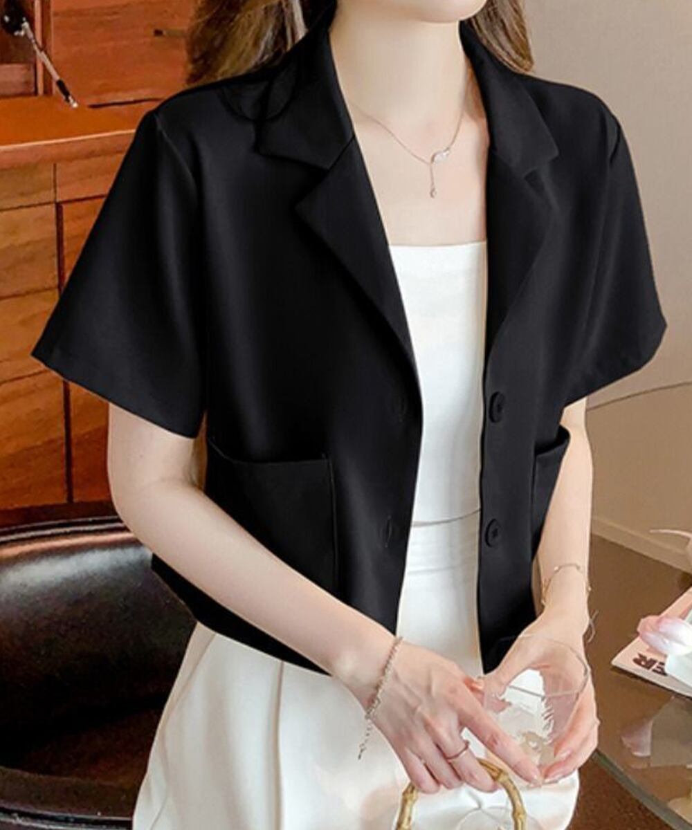大人ショートカーデ サマーカーデ韓国風 襟付き軽アウター黒
