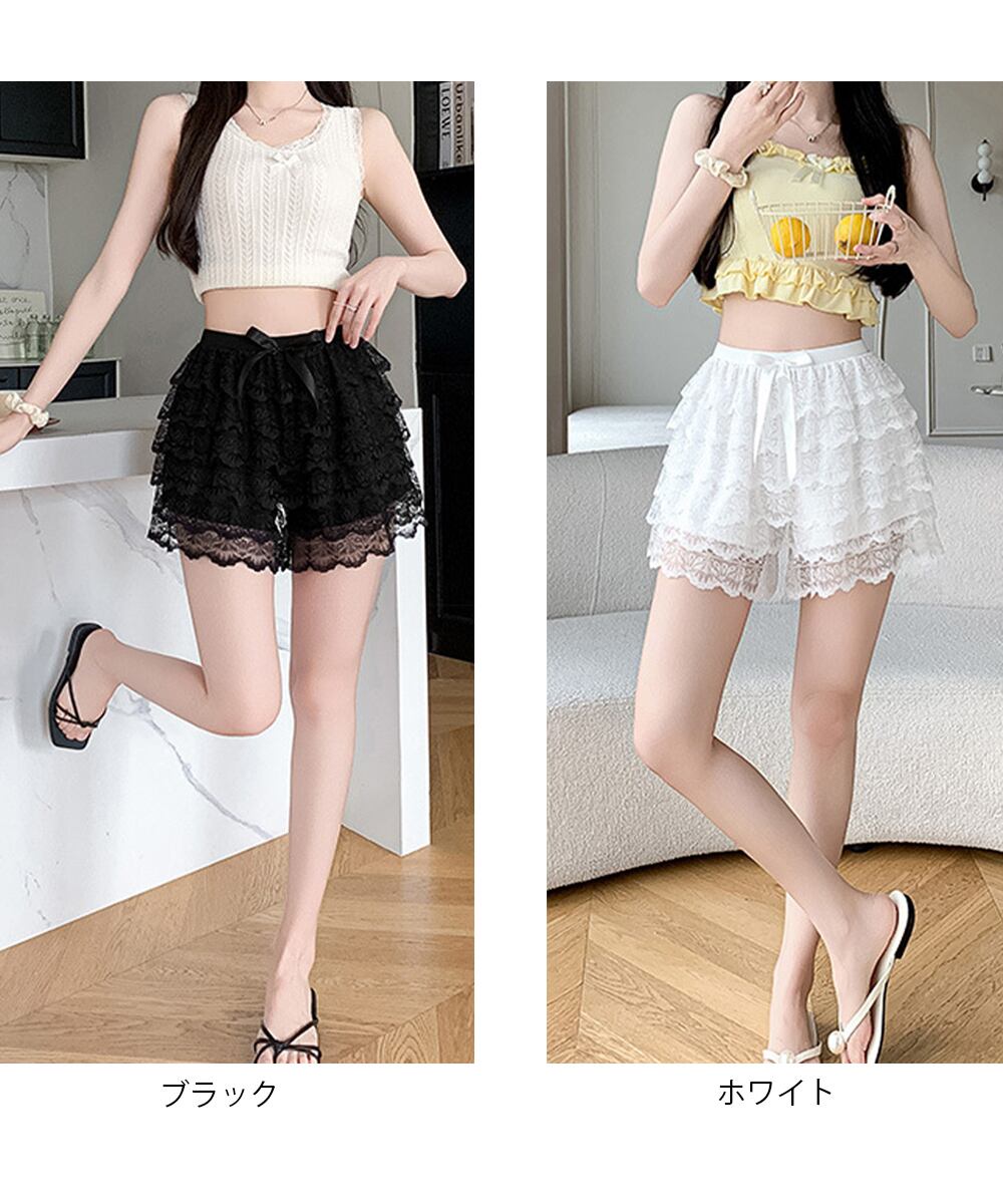 透け防止フリルインナーパンツ 総レース 楽ちん部屋着 チラ見せ防止タップパンツ 涼しい寝間着 ウエストゴムショートパンツ可愛いルームパンツ ナイトウエア 薄手 ボリューム見せパンガーリーな雰囲気が漂う多層総レースのティアードペチコート
