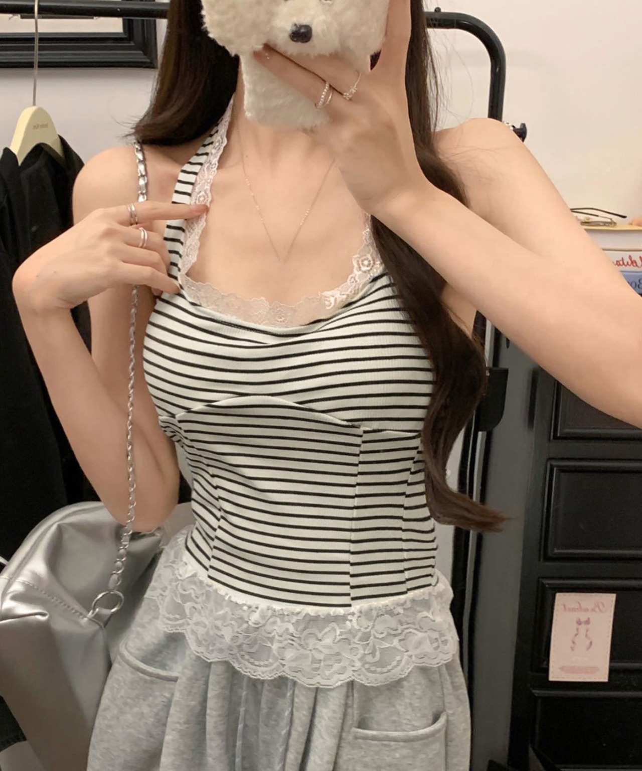 【日本倉庫即納】 裾フリルレースホルターネックタンクトップ