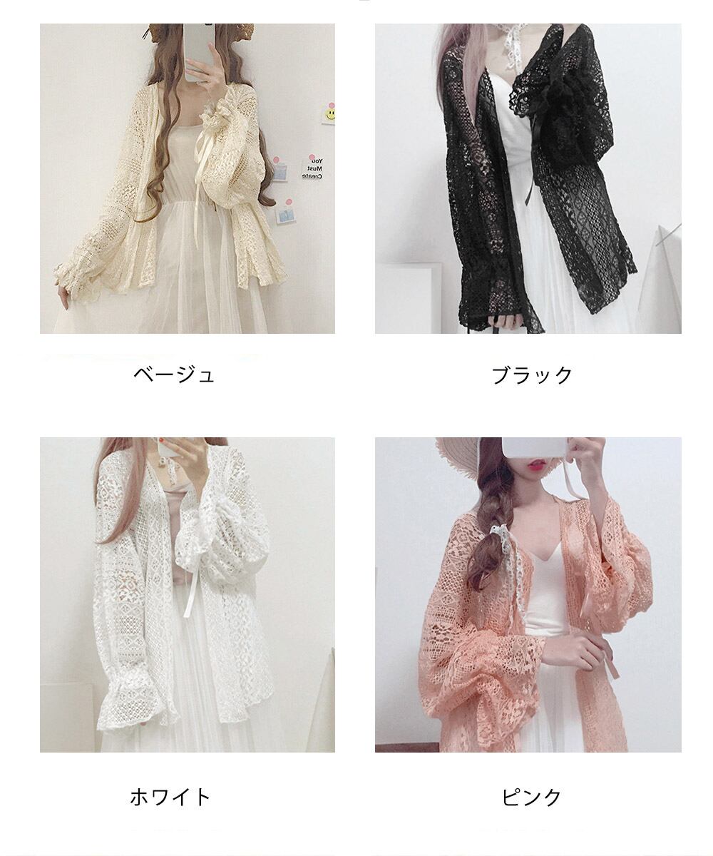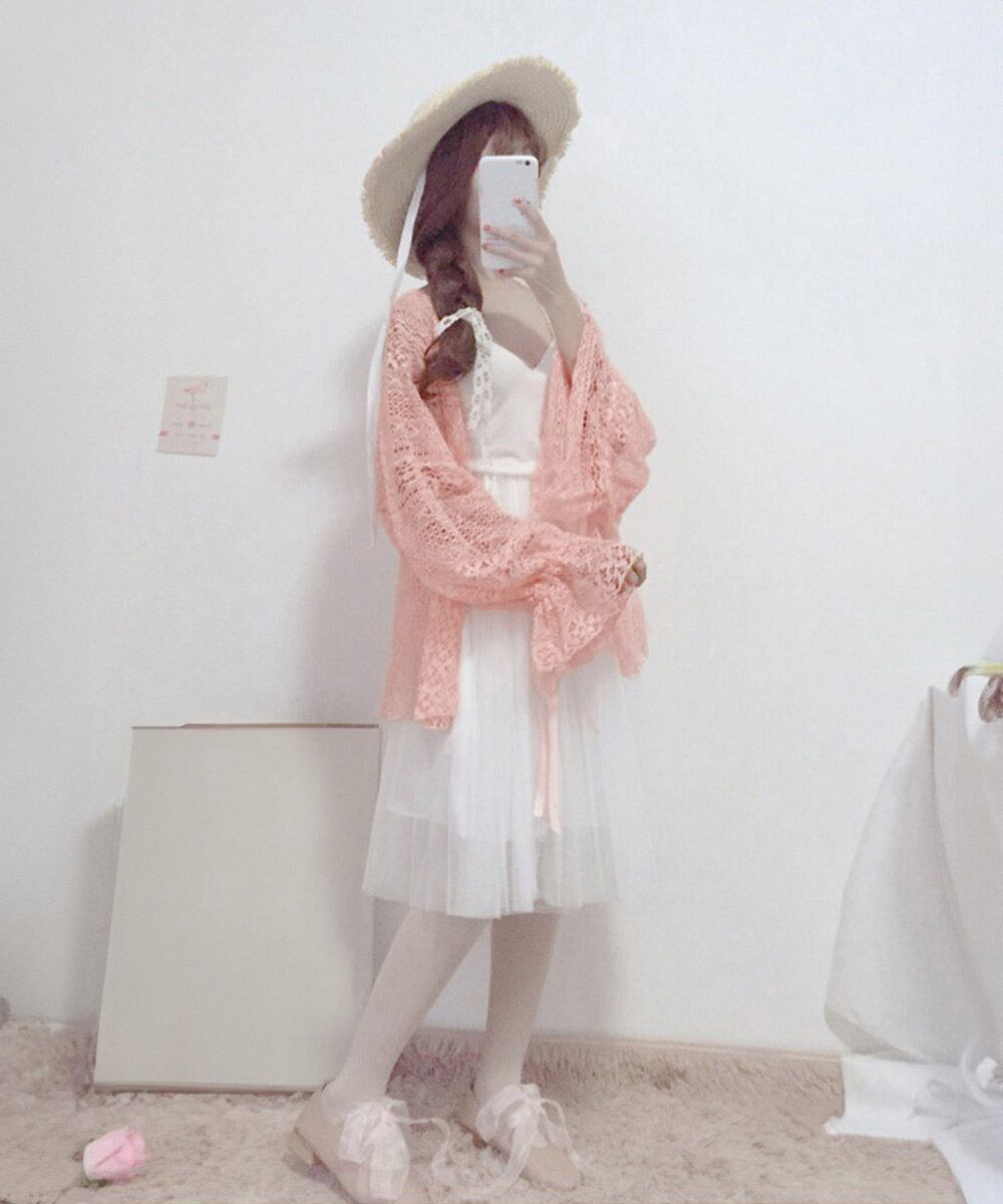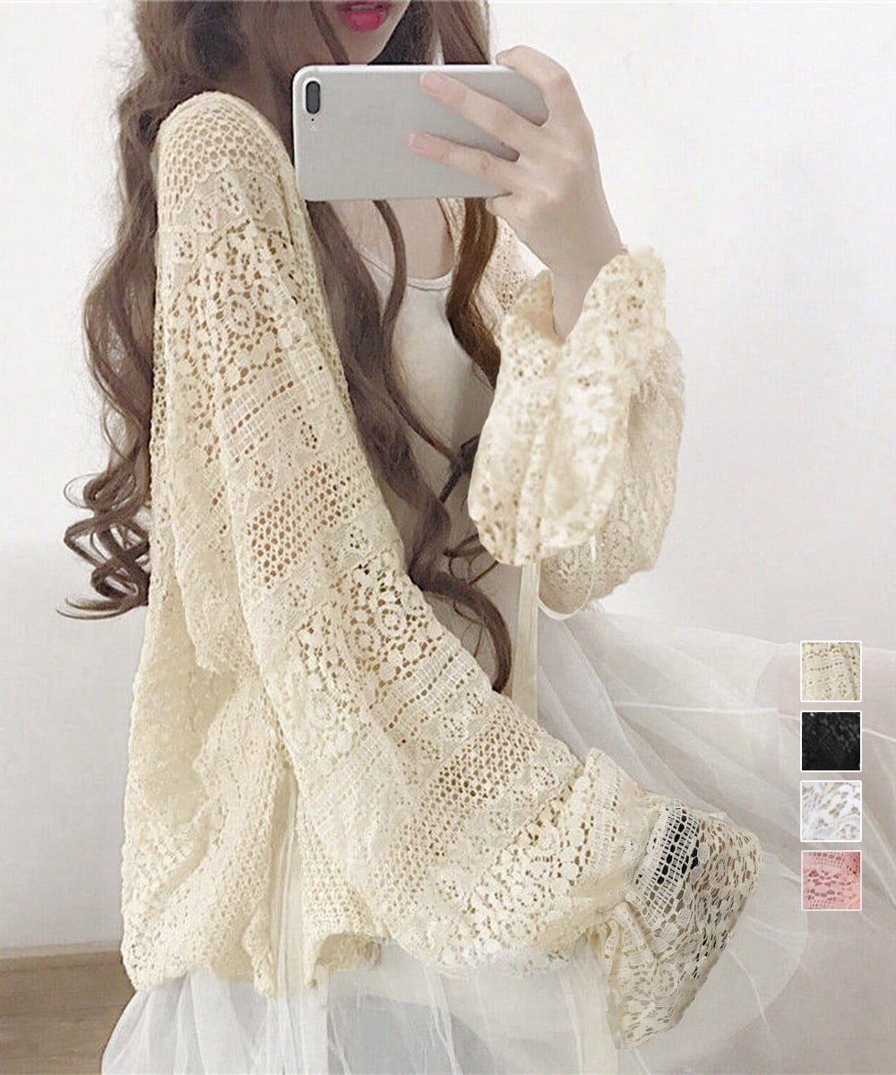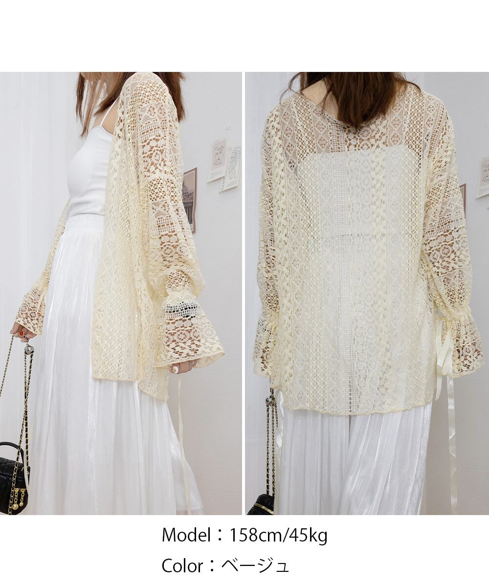 【日本倉庫即納】 透かし編み レースカーディガン リボン袖