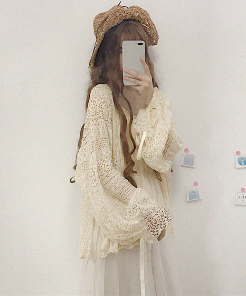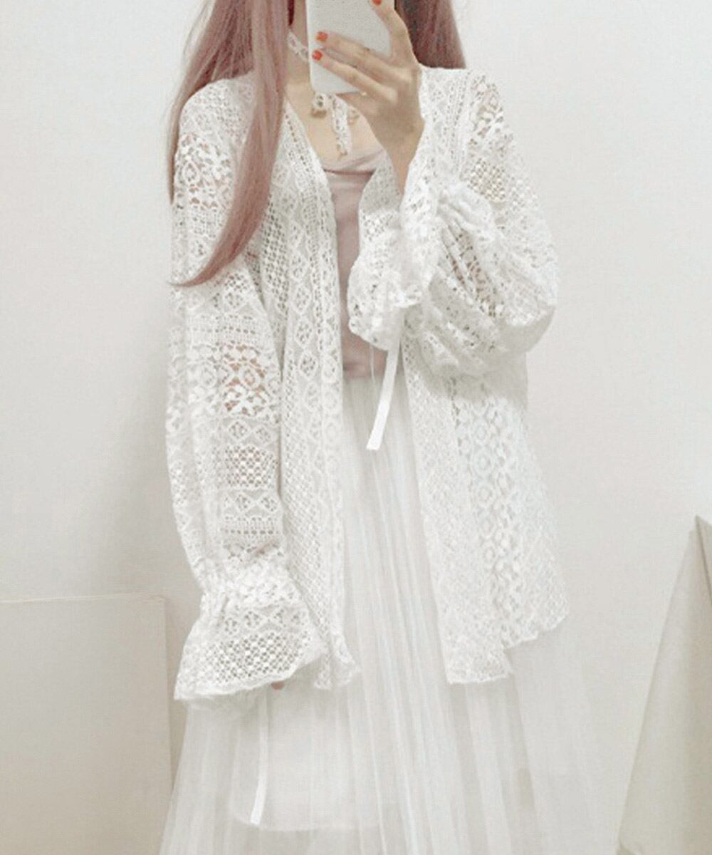 繊細なレース素材が目を引く、フェミニンな透かし編みカーディガン。
