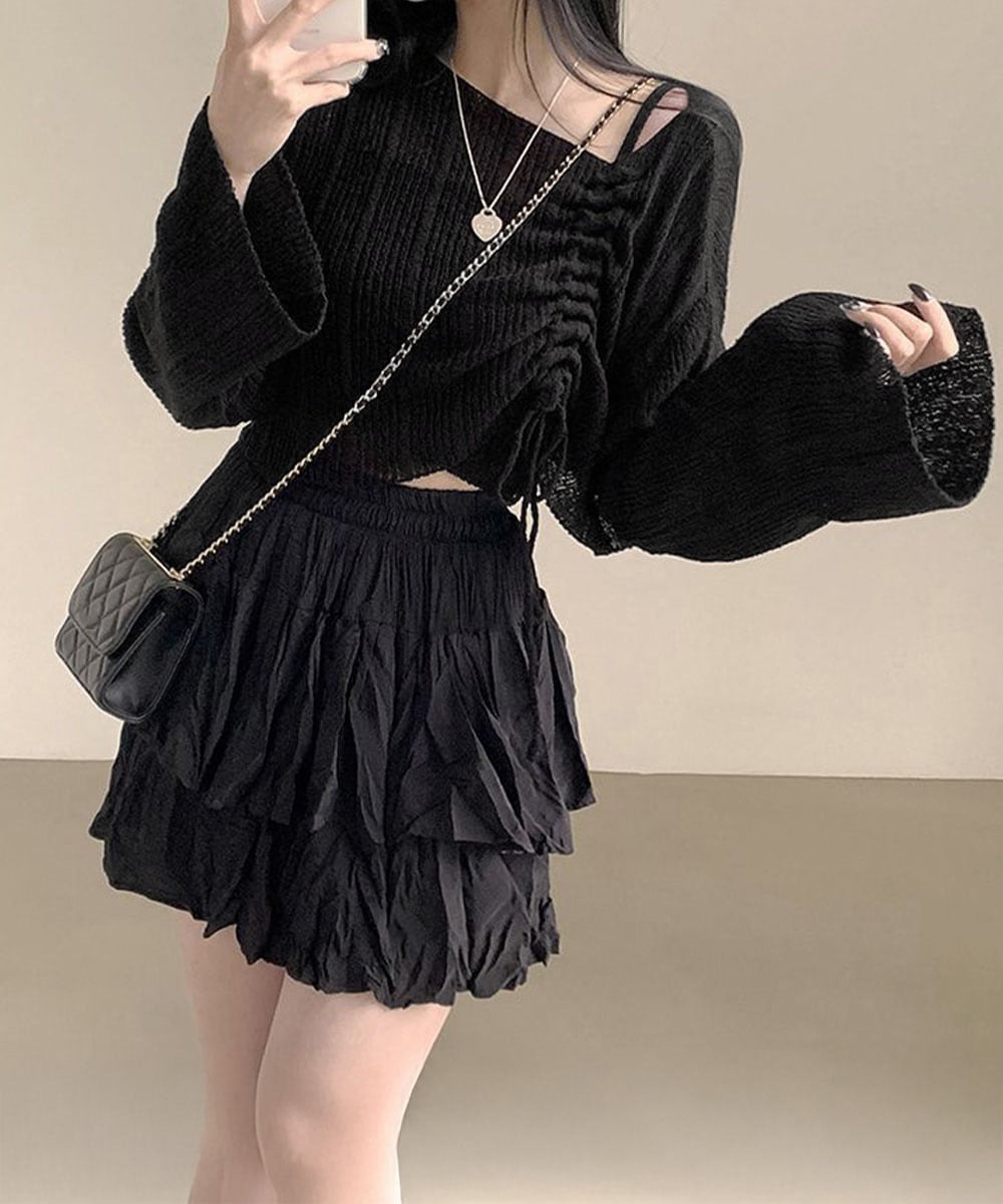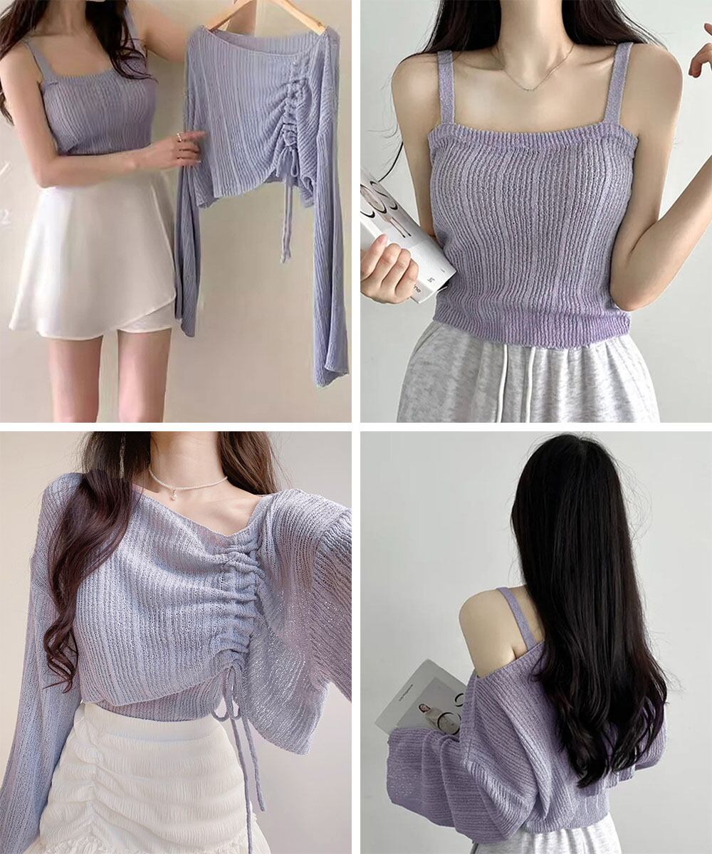 ドローストリングでシルエットの調整ができるのが魅力のマルチリブニットトップスとニットキャミソールの2点セットアップ