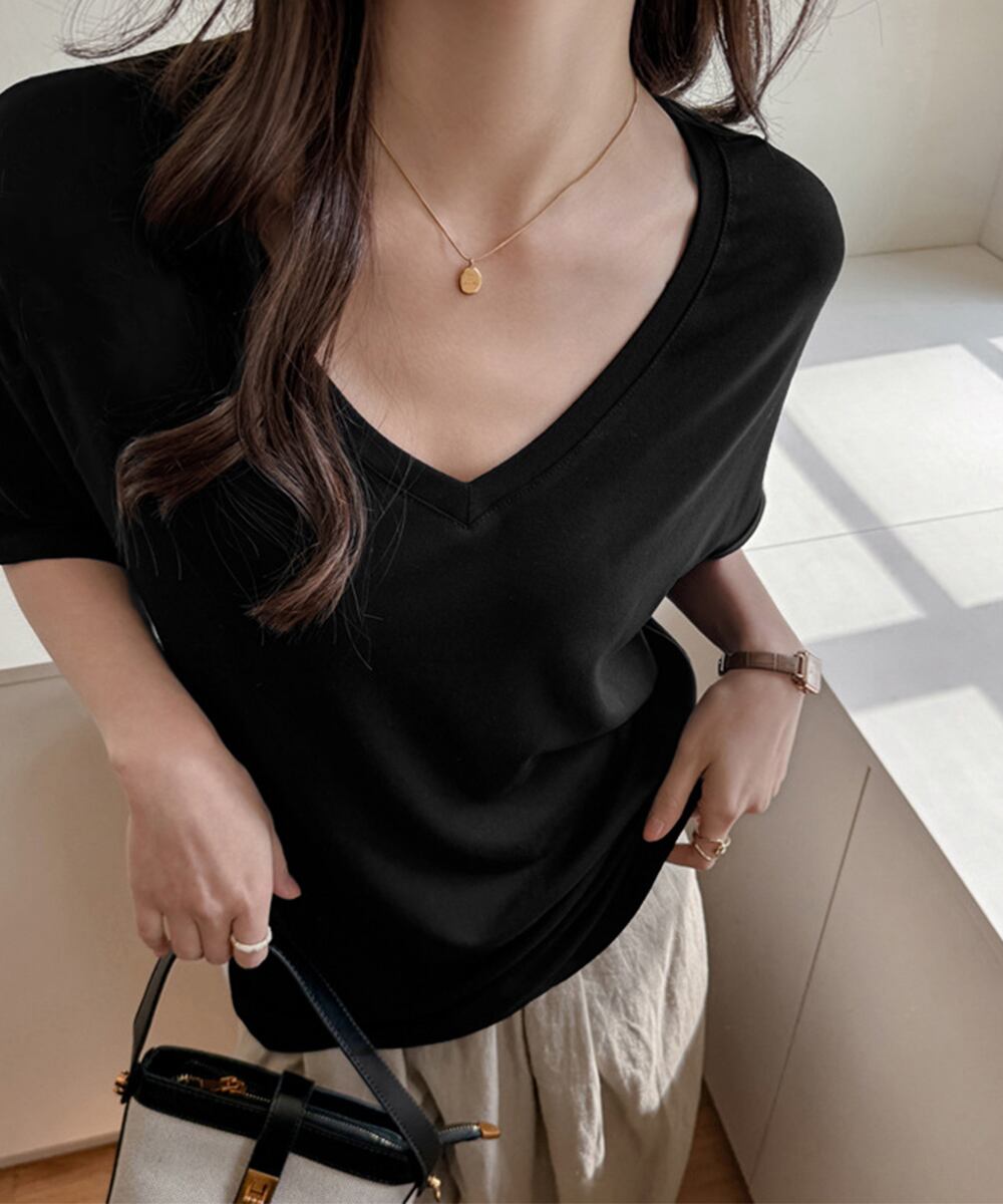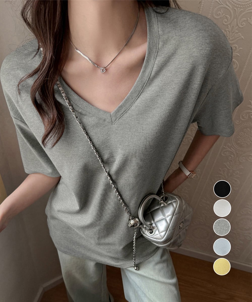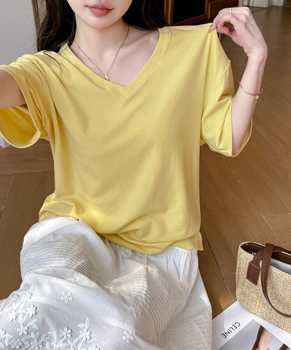 オーバーサイズvネックtシャツ 涼しい五分袖 着やせ夏トップス ゆったり シンプルロングカットソーゆるチュニックtシャツ薄手Tシャツ着回し 体型カバーtシャツ さらさらTシャツ夏Vネックが抜け感を演出する、シンプルなオーバーサイズの半袖Tシャツ。