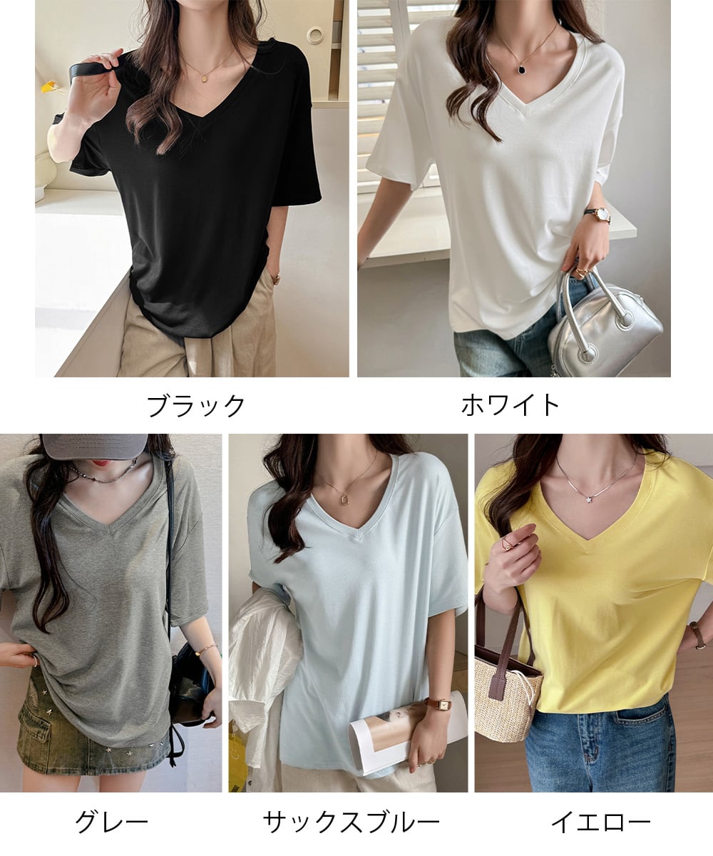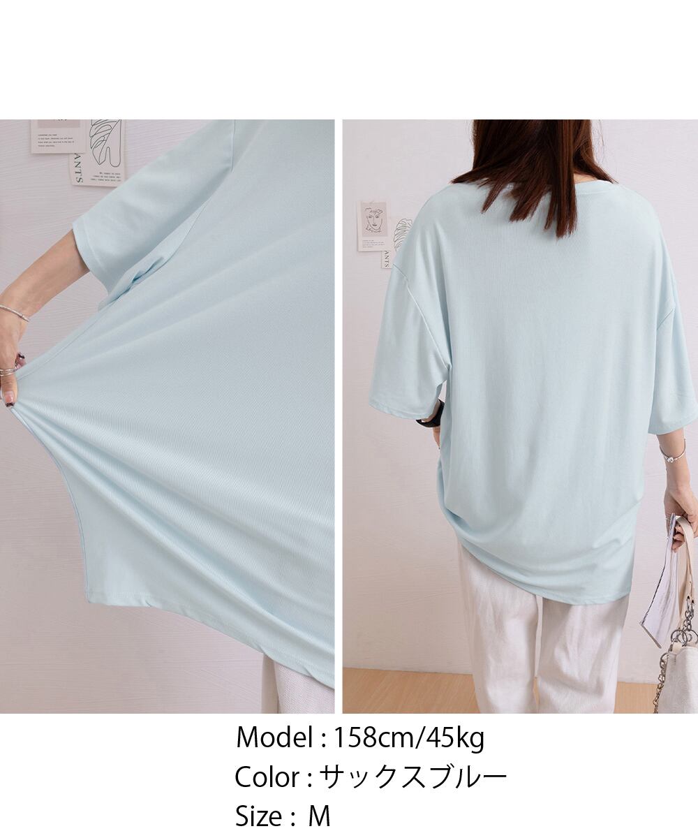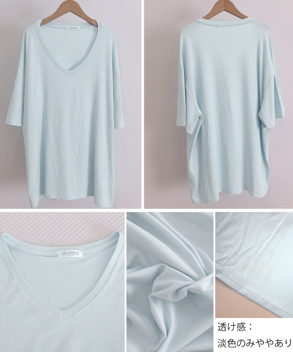 オーバーサイズvネックtシャツ 涼しい五分袖 着やせ夏トップス ゆったり シンプルロングカットソーゆるチュニックtシャツ