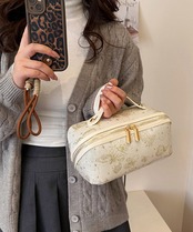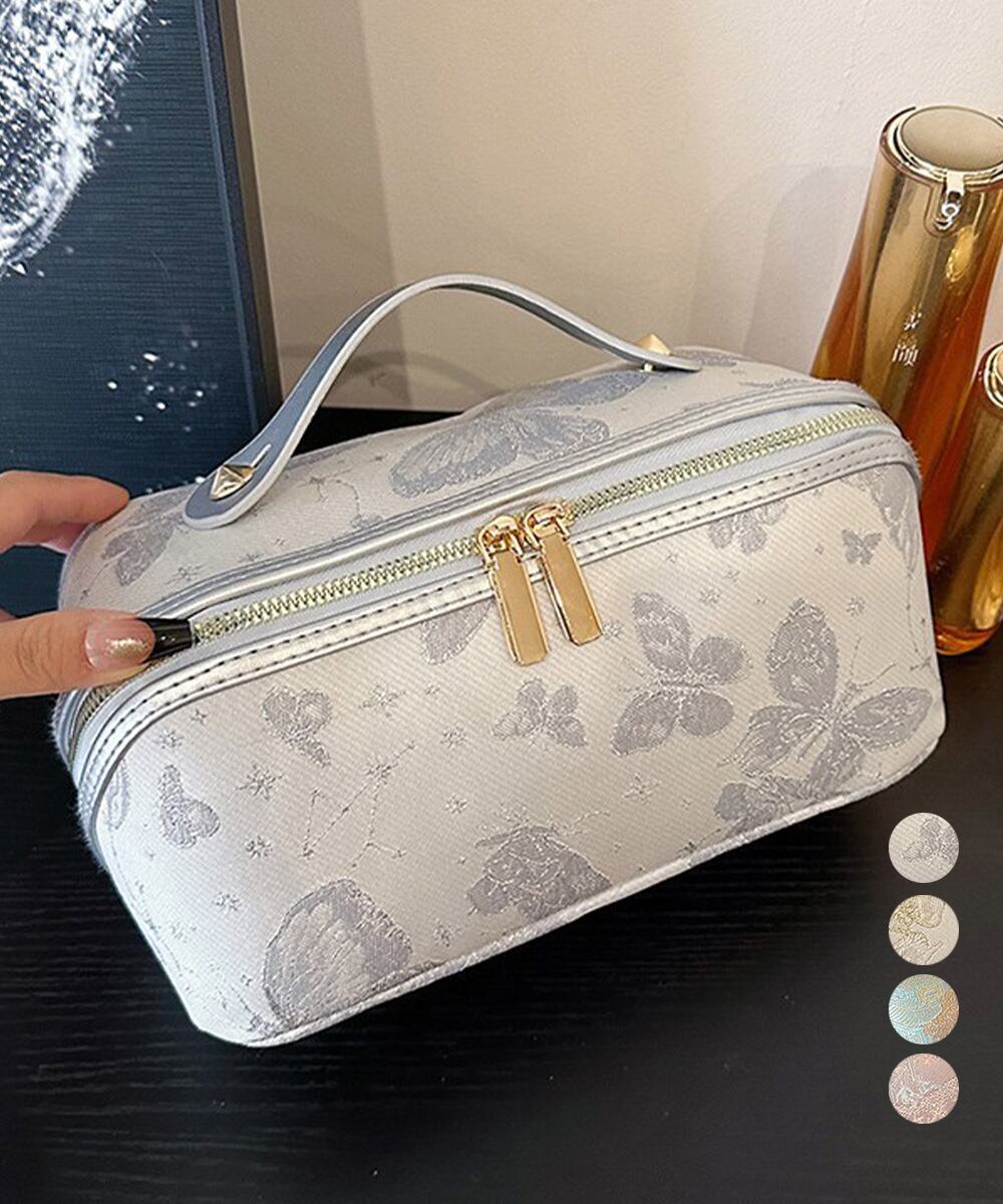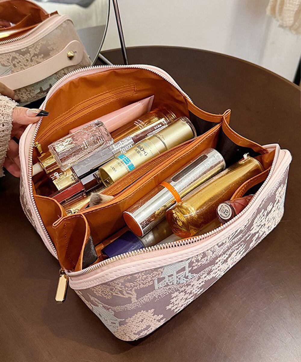 古風化粧ポーチ きれいめ大人可愛いバニティポーチ おしゃれ旅行コスメポーチ 持ち運び化粧品収納 大容量トラベルポーチ自立小物入れバッグ上品 仕切り収納 大きめ 高級感コスメケース上品な刺しゅう風デザインの大容量メイクポーチ。