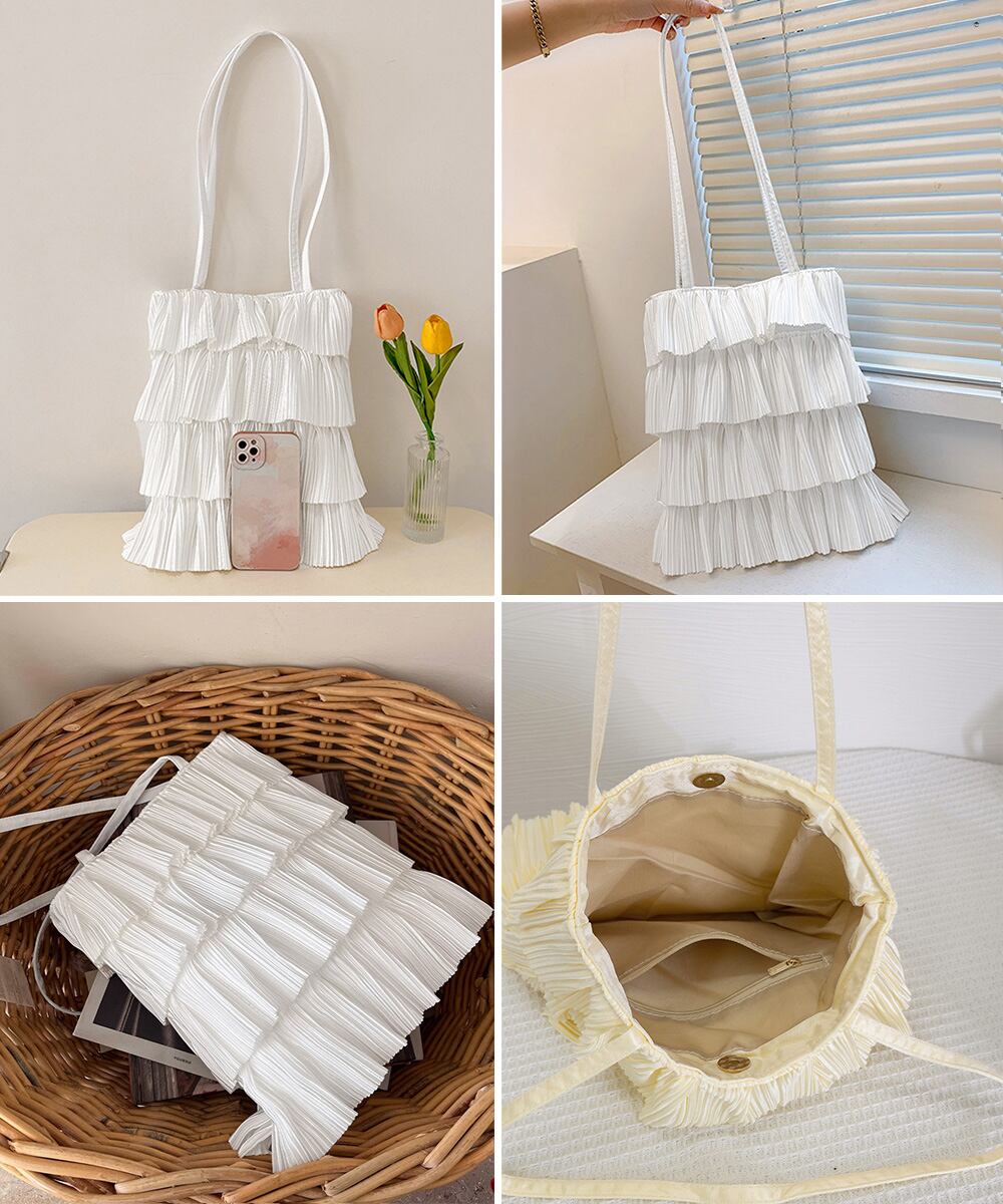 大人可愛いプリーツトート カジュアルきれいめ 肩掛けバッグ 大容量 韓国風バッグ おしゃれ 女性 ティアードバッグ 軽量スクエアバッグ縦型 軽やかなドット柄鞄 サブバッグ通勤通学華やかなフリルが目を引くプリーツデザイントートバッグ。