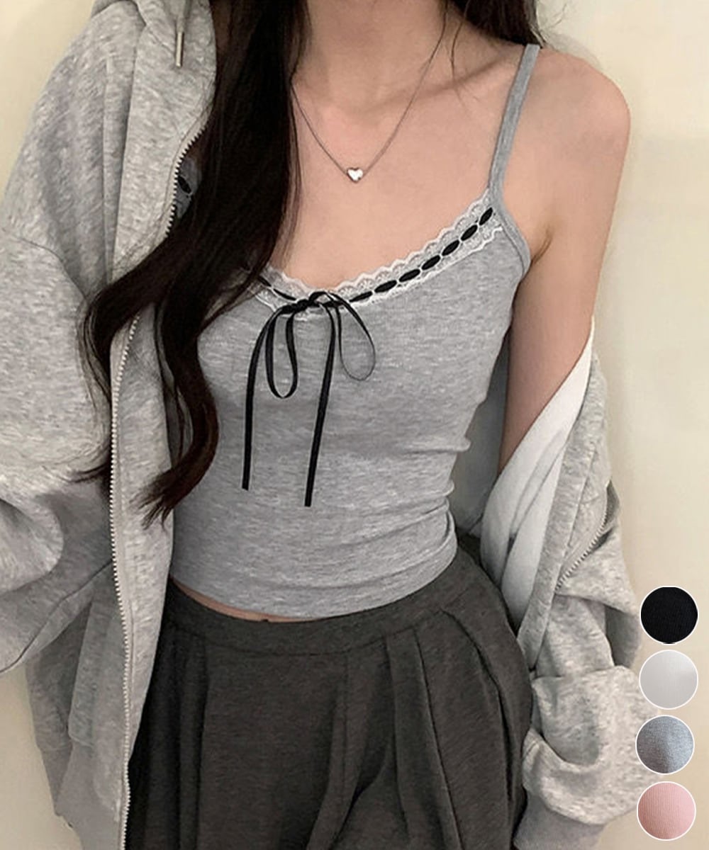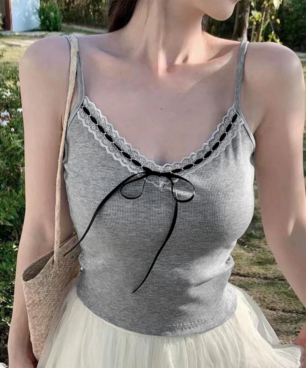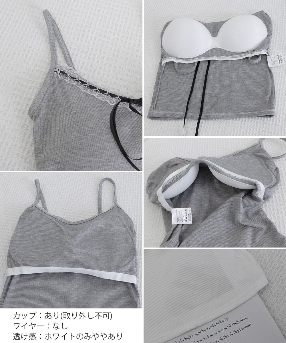 レディース フロントリボンリブキャミ 着回し肌着 フィット ブラトップ おしゃれインナートップス フェミニン ブラキャミ見せインナー重ね着 大人可愛いキャミ夏 韓国風キャミトップレースとリボンのディテールが可愛らしい、カップ付きリブ編みキャミソール。