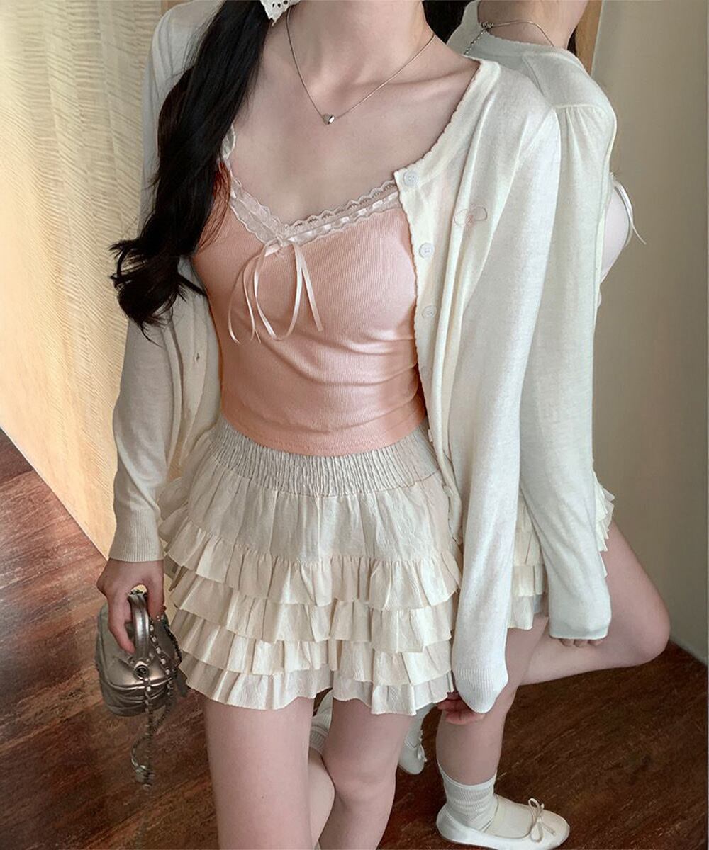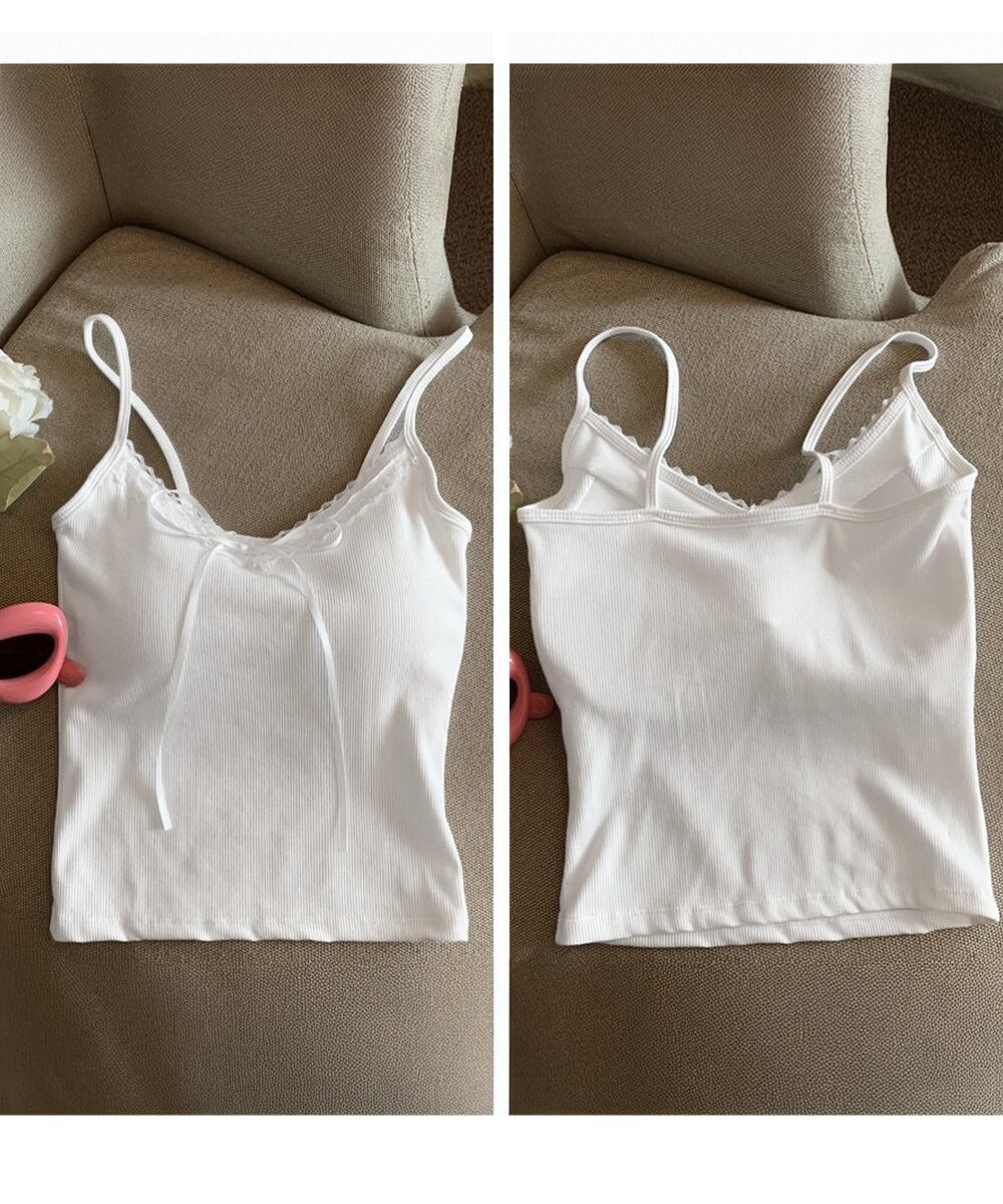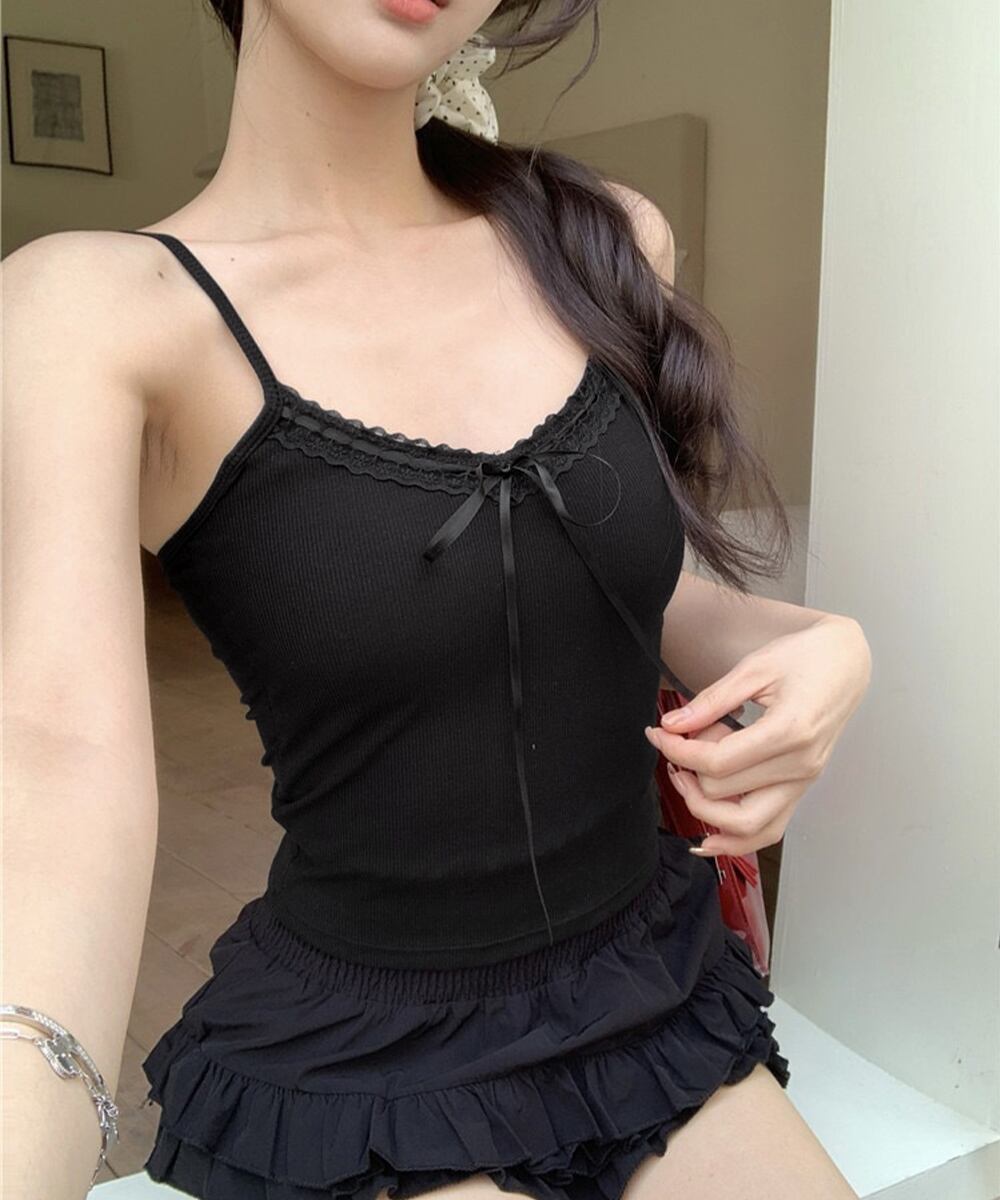 レディース フロントリボンリブキャミ 着回し肌着 フィット ブラトップ おしゃれインナートップス フェミニン ブラキャミ見せインナー重ね着 大人可愛いキャミ夏 韓国風キャミトップレースとリボンのディテールが可愛らしい、カップ付きリブ編みキャミソール。