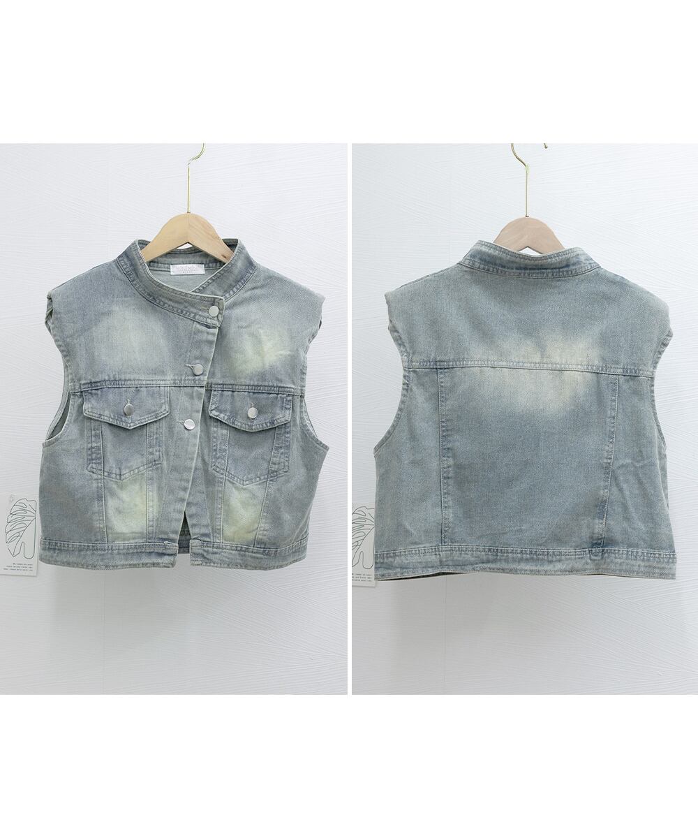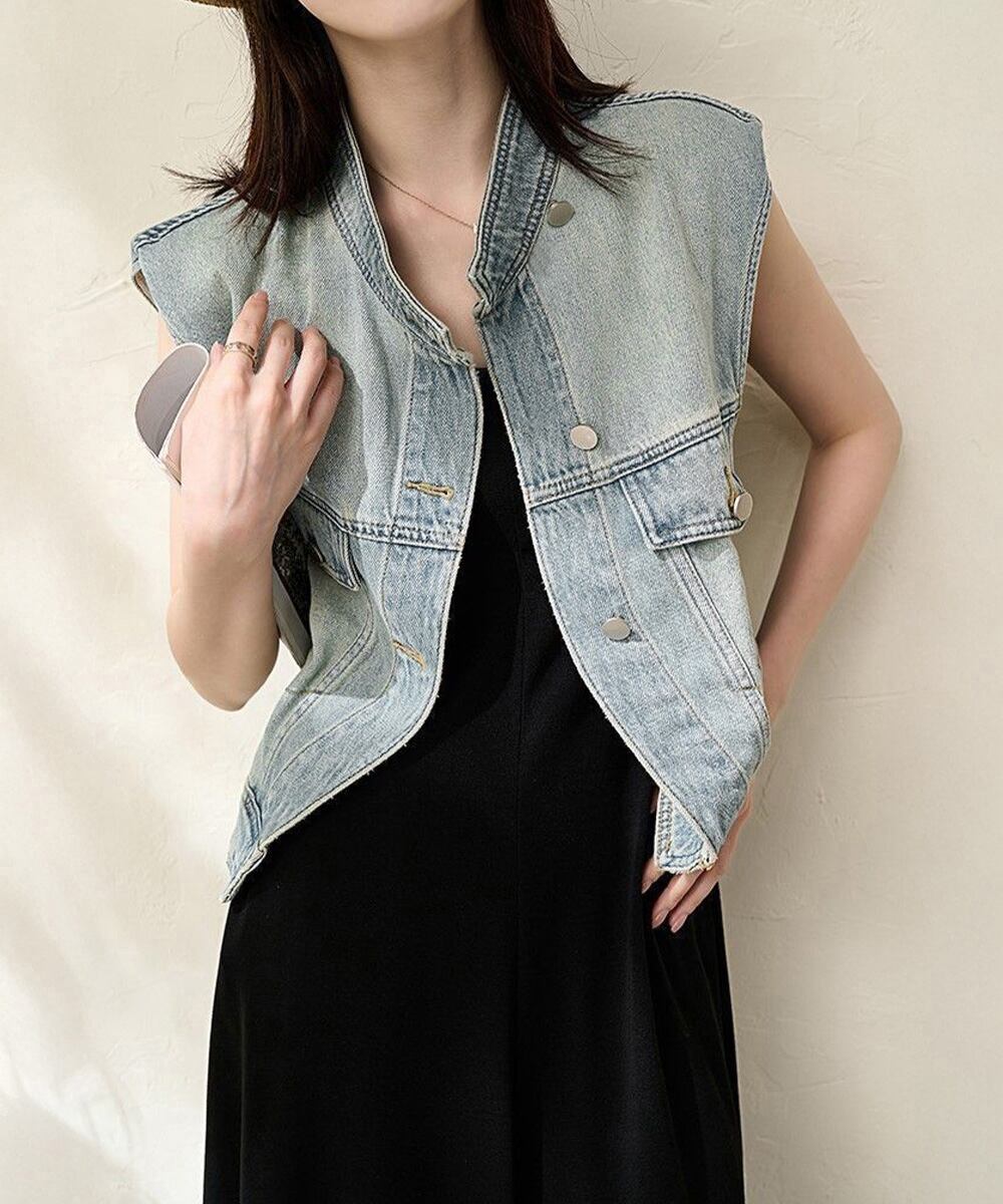 スタンドカラー デニムジャケットノースリーブ 体型カバー ゆったりデニムジレ 肩パッド入り レトロ韓国風カジュアルジレこなれ感トップス春 軽やか 春アウター ライトアウター春夏ヴィンテージ風デニムベストが登場。