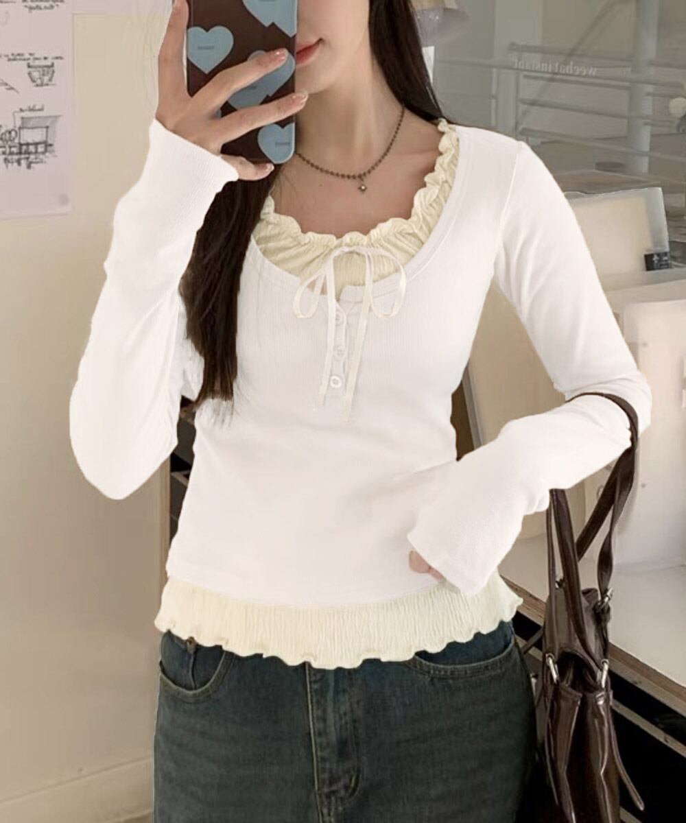 着やせトップス フェミニンTシャツ 韓国ファッション