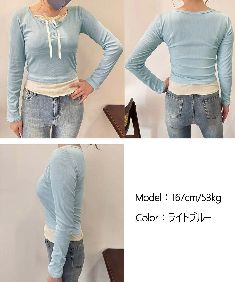 まるで重ね着しているように見えるフェイクレイヤードデザインが特徴の長袖トップスです。