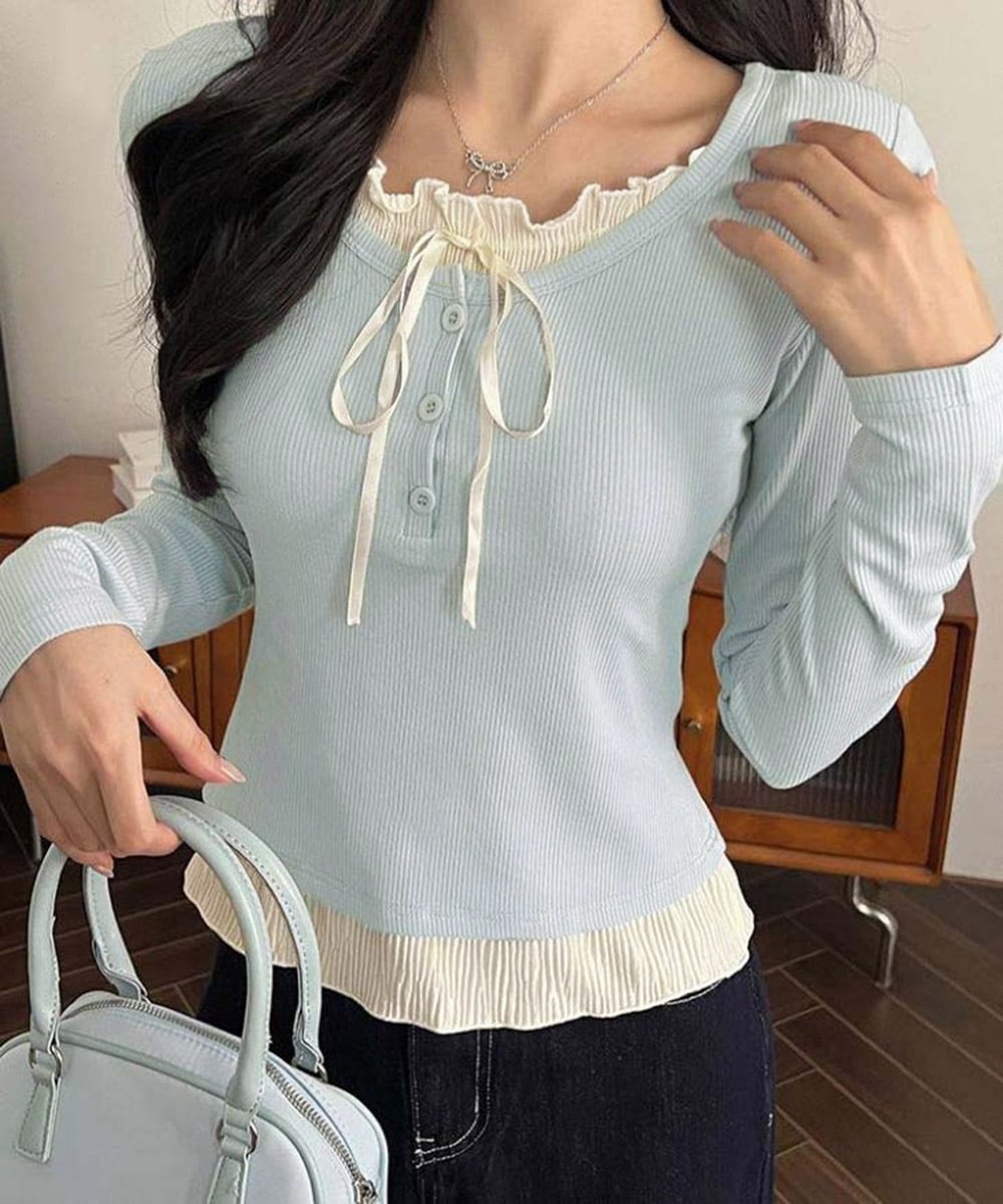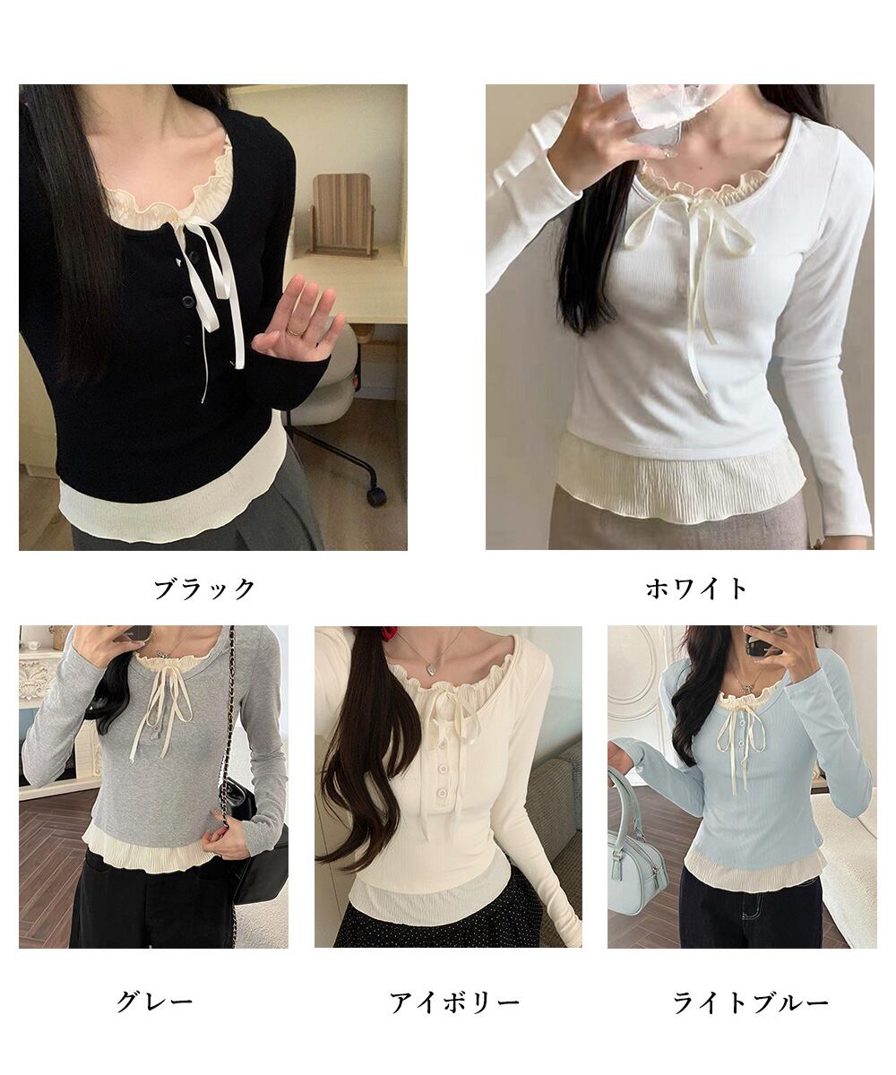 レディース バレエコアトップス フリル リブトップス 着回し 可愛い カジュアルコーデ 無地 フェミニン 長袖Tシャツ