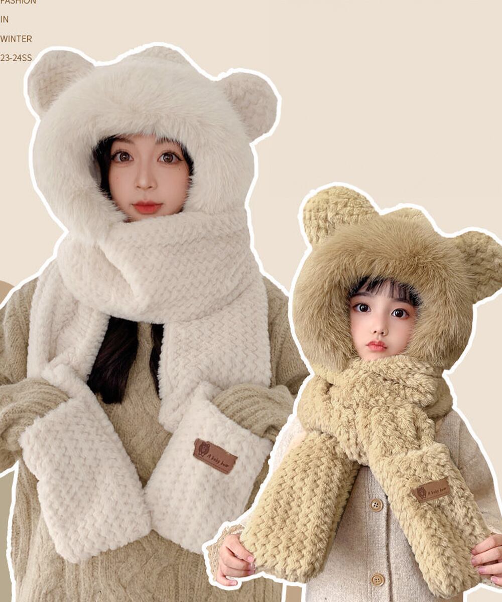 帽子、マフラー、手袋が一体型になった、可愛いクマデザインのポアニット帽です。