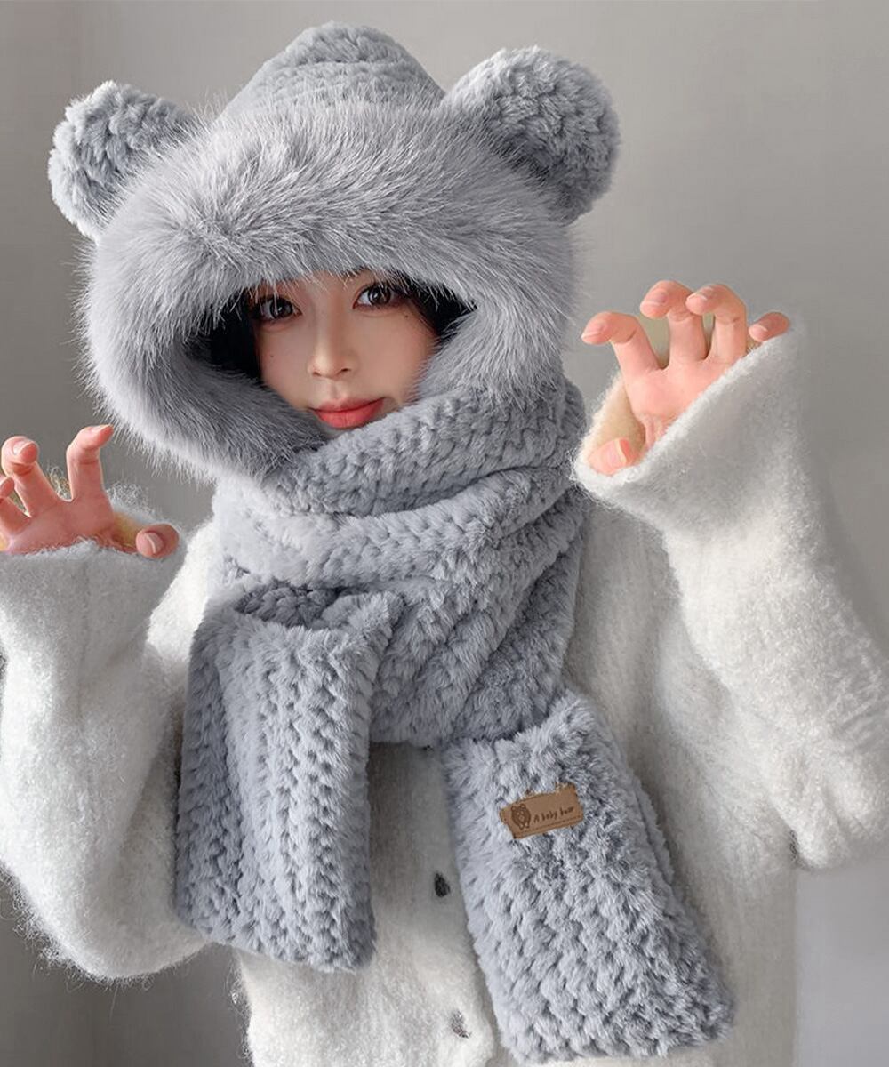 ふわふわファー帽子 あったかネックウォーマー フード付マフラー 秋冬 アニマル耳付き ぬいぐるみ帽子 アウトドア寒さ対策