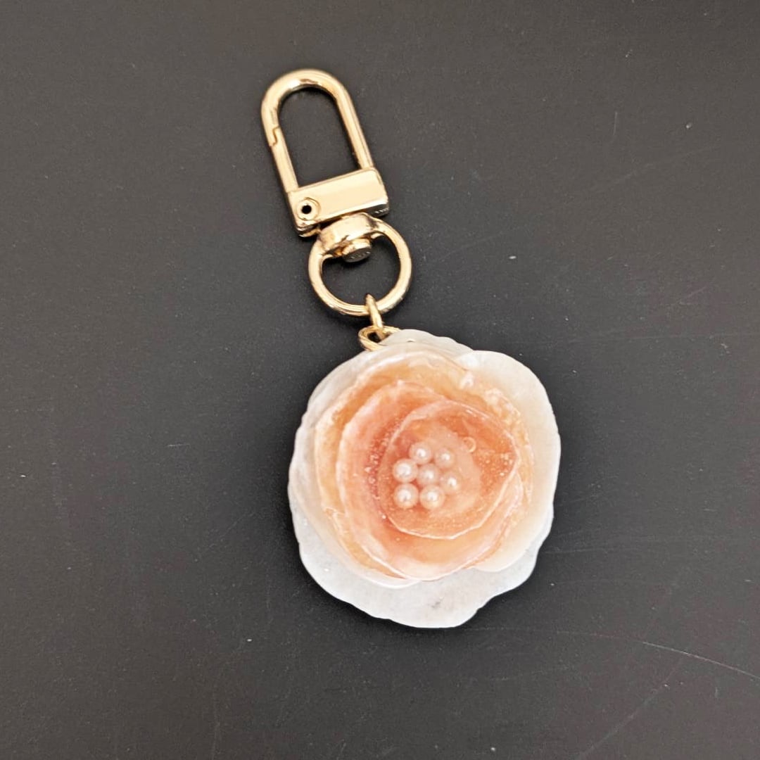 海辺に咲く花をイメージして、天然貝殻を一枚一枚重ねて作ったシェルローズキーホルダー。