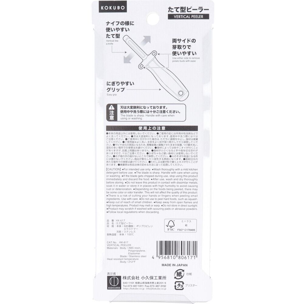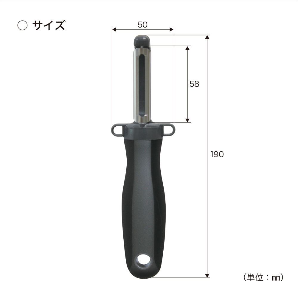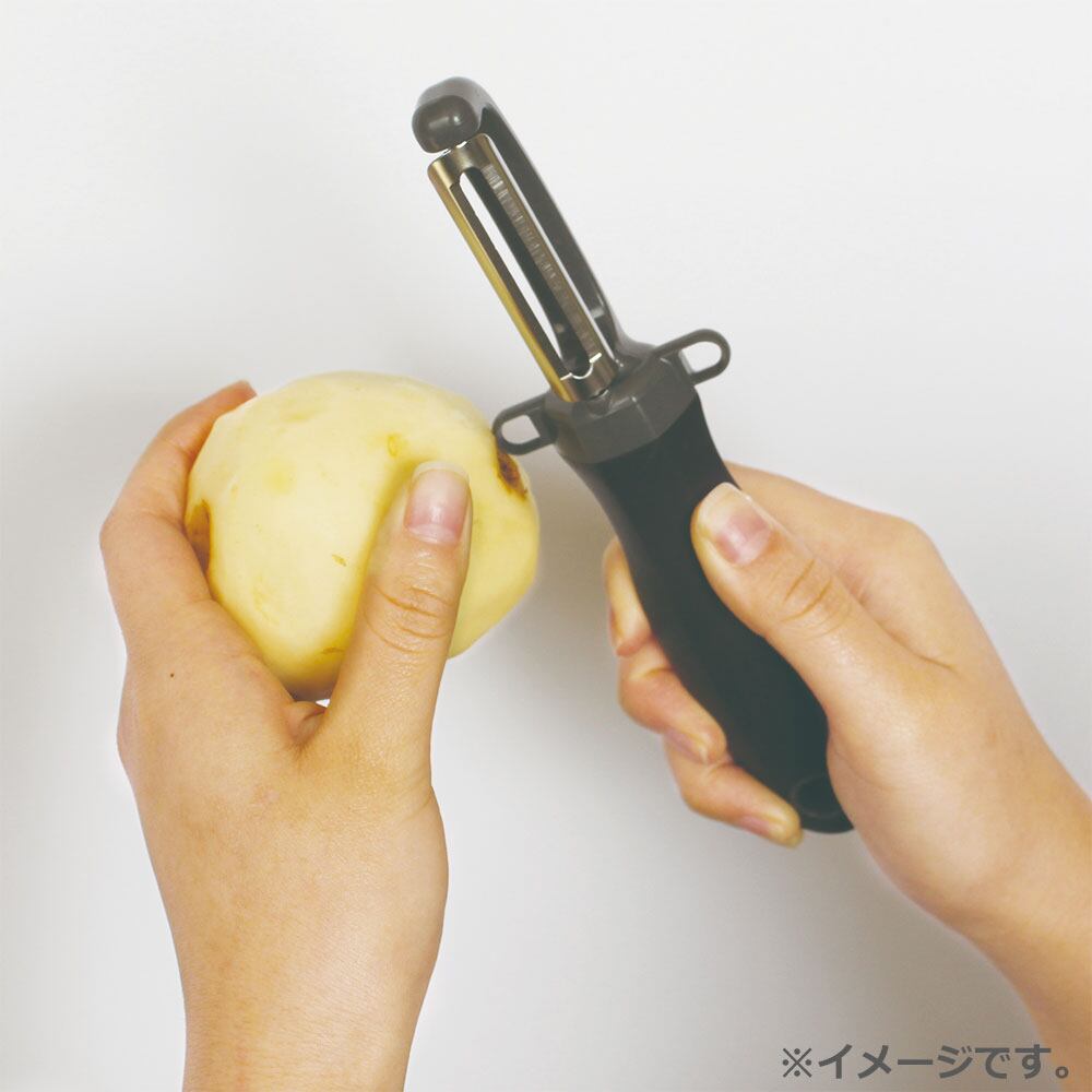 ナイフの様に使いやすいたて型。両サイドの芽取りで使いやすい。※刃は大変鋭利になっております。使用中や洗う際には十分ご注意ください。