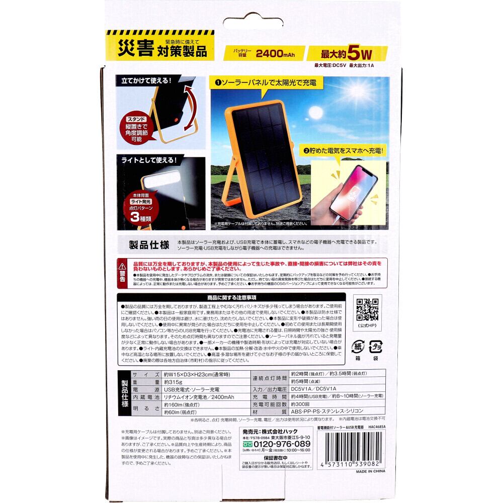 【3セット】蓄電機能付きソーラー&USB充電器 HAC4685A