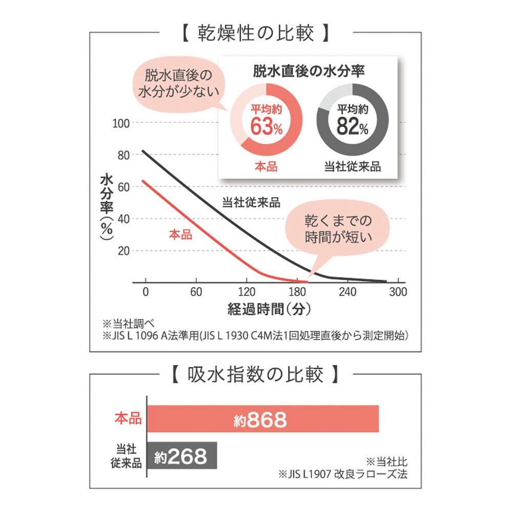 ●脱水直後の水分率。日繊商工社従来品と比較して、洗濯脱水後の水分が約20%ほど多く抜けています。このことは、マイクロファイバーの水分が拡散しやすい性質が作用していると考えられます。※ご協力のお願い!推奨価格がある商品です。価格のご確認をお願い致します。推奨価格での販売のご協力をお願い致します。推奨1700円(税抜)