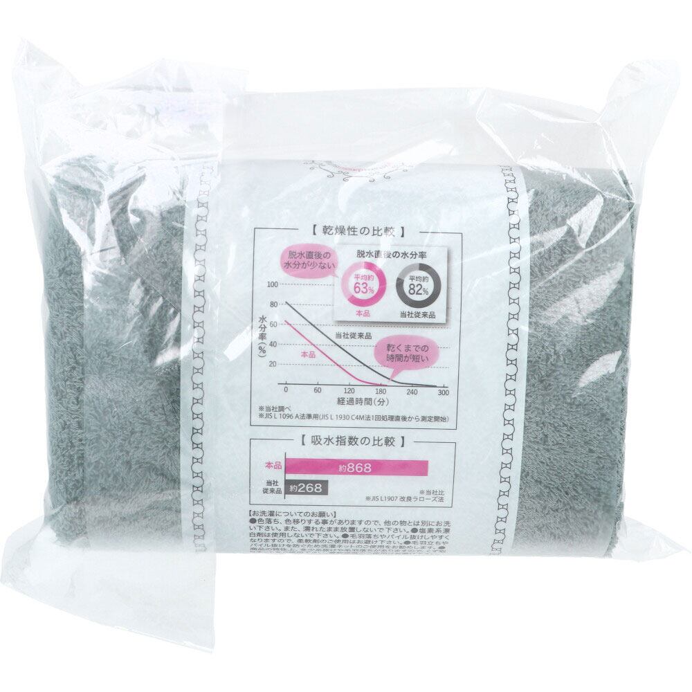 ●吸水力。マイクロファイバーの吸水作用とパイルに中空糸を使用することによって吸水力がUP。高吸水素材を謳えるタオルとなっています。(吸水指数868)