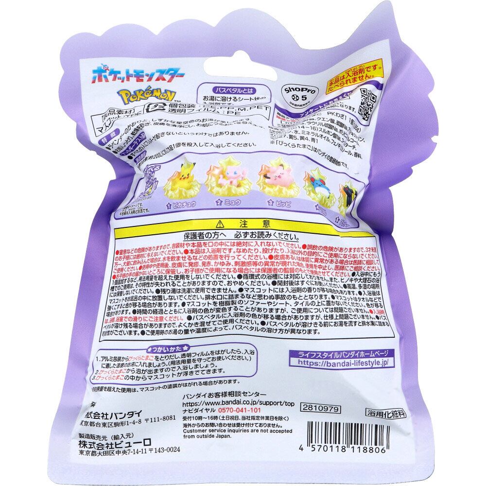 ●中から出てくるマスコットは全部で5種類!※いずれか1つが入っています(※種類は選べません)。台座つき(※台座は入浴剤と別添です)。・ピカチュウ・ミュウ・ピッピ・マリル・ブラッキー