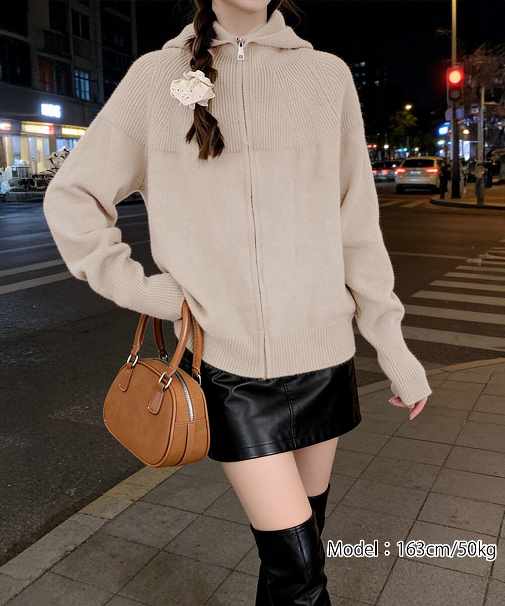 ニットジップパーカー フード付きニットカーデ 長袖ニットトップス 着回し 前開き ニットウェア ゆったり ニットアウター