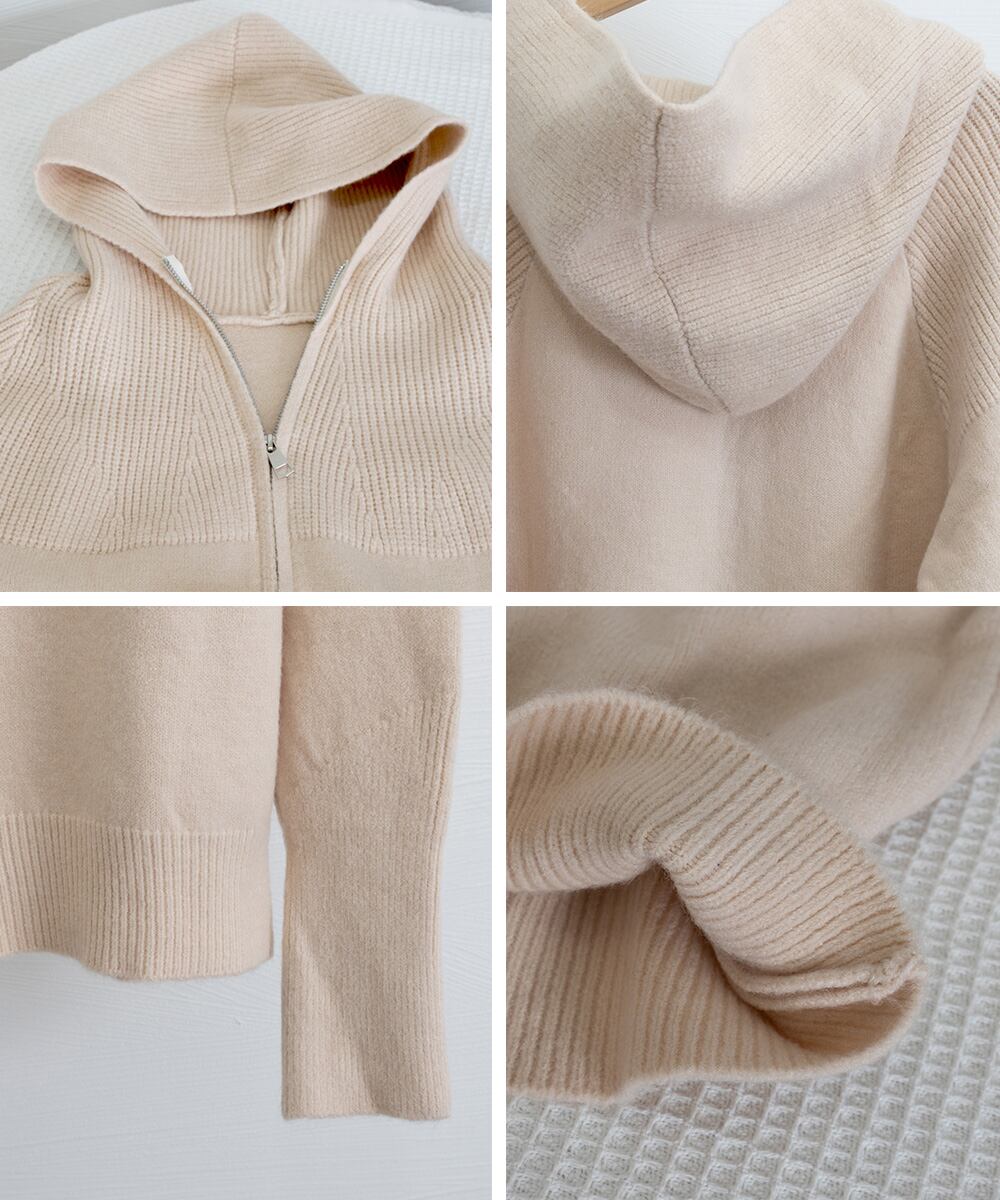 フード付きデザインがポイントのジップアップニットパーカー。