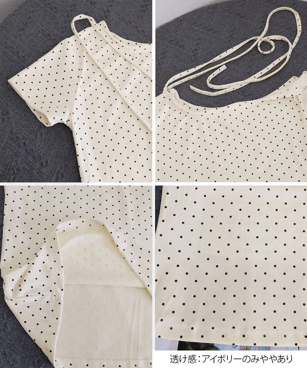 水玉柄が映える、オフショルダー×リボンデザインのレディース半袖Tシャツ。