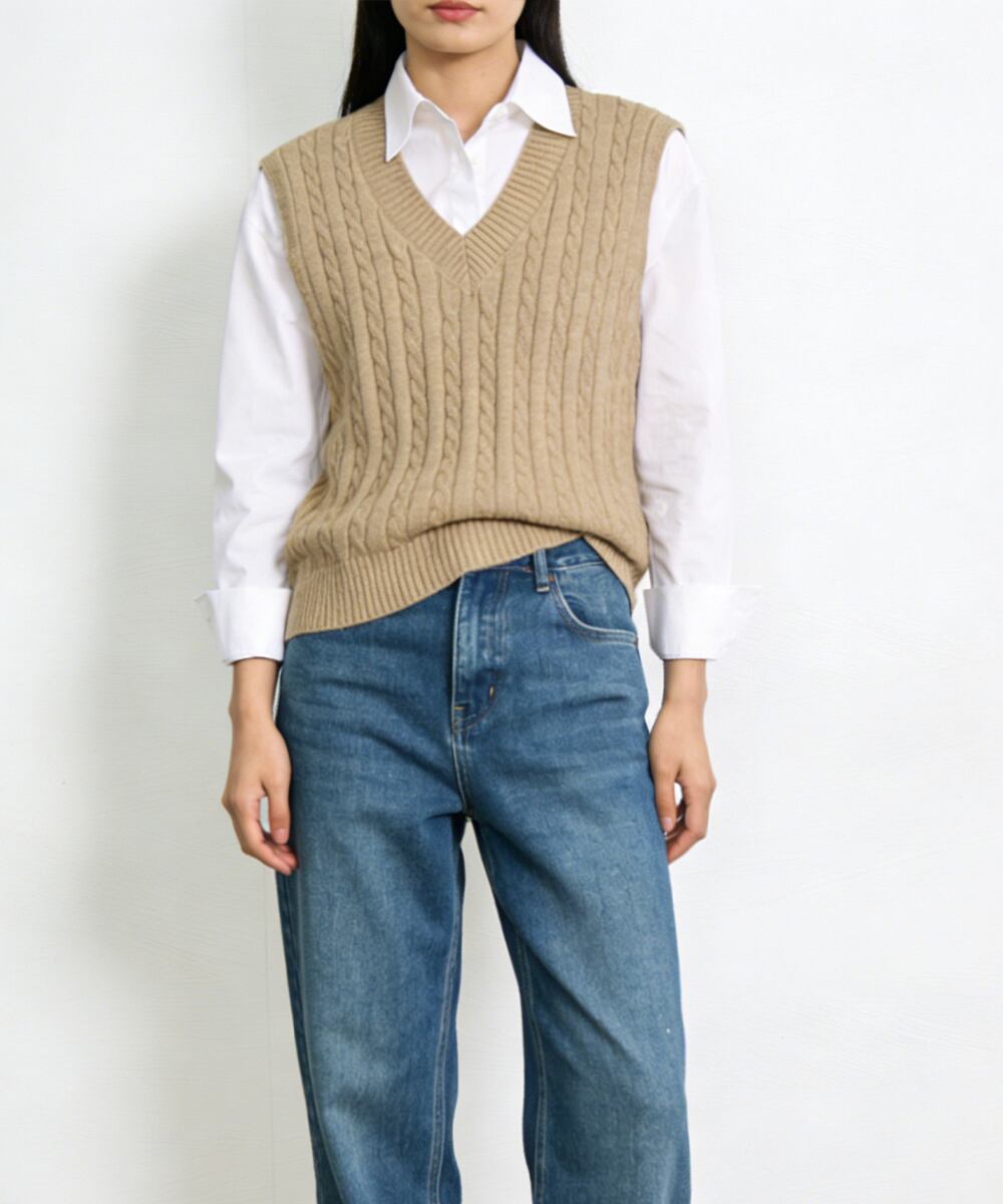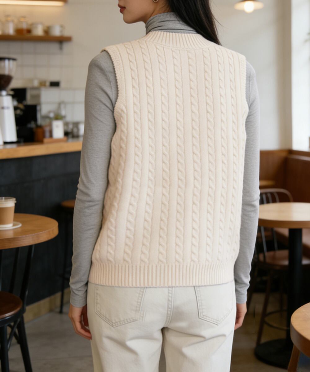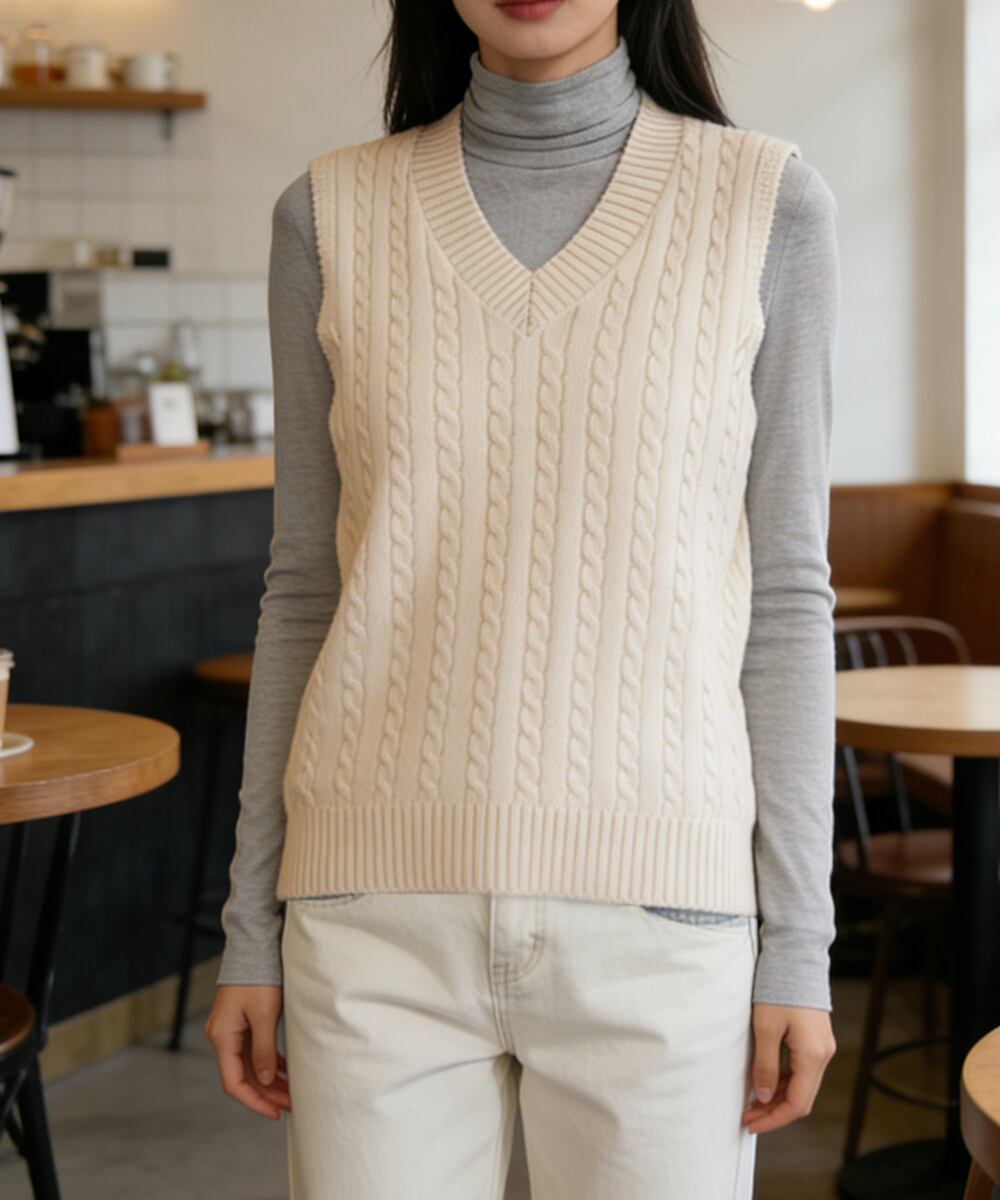 立体感のあるケーブル編みが特徴のVネックニットベスト。