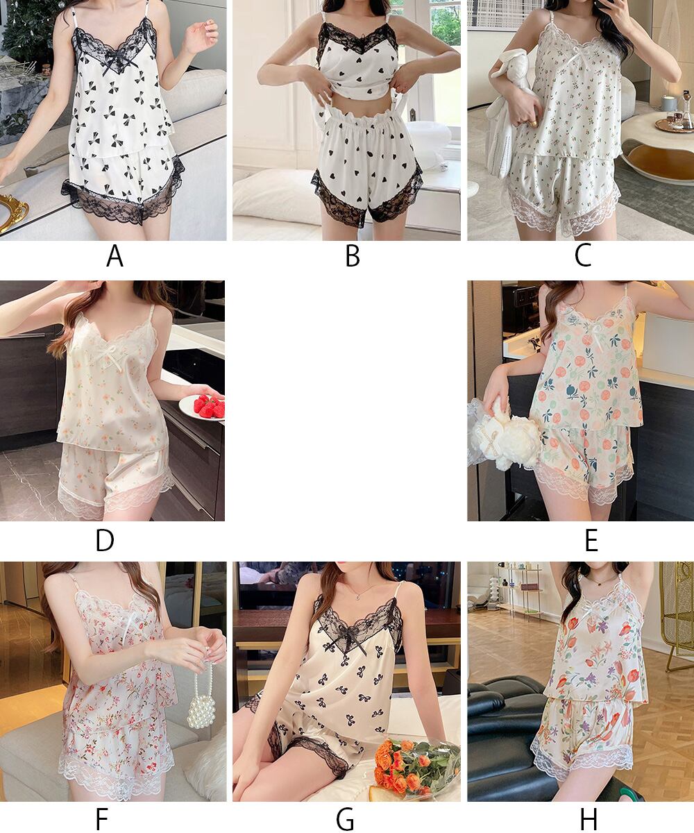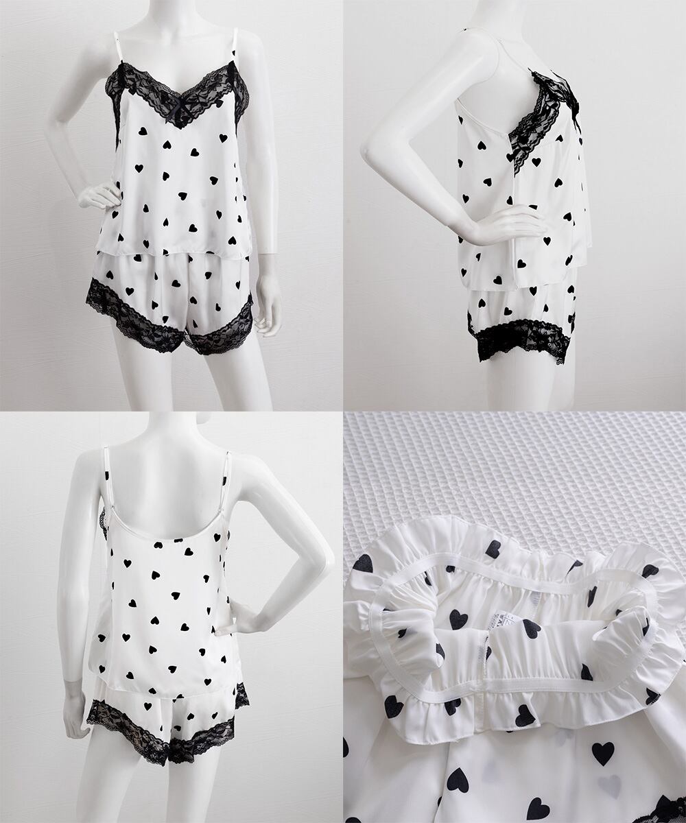 花柄・ハート柄・リボンモチーフなど、豊富なデザインとレース縁取りを施したVネックキャミソールパジャマ上下セット。