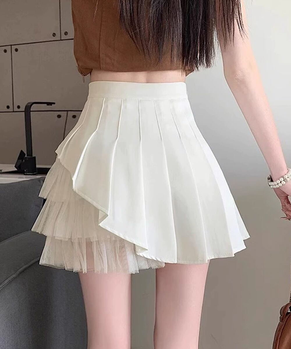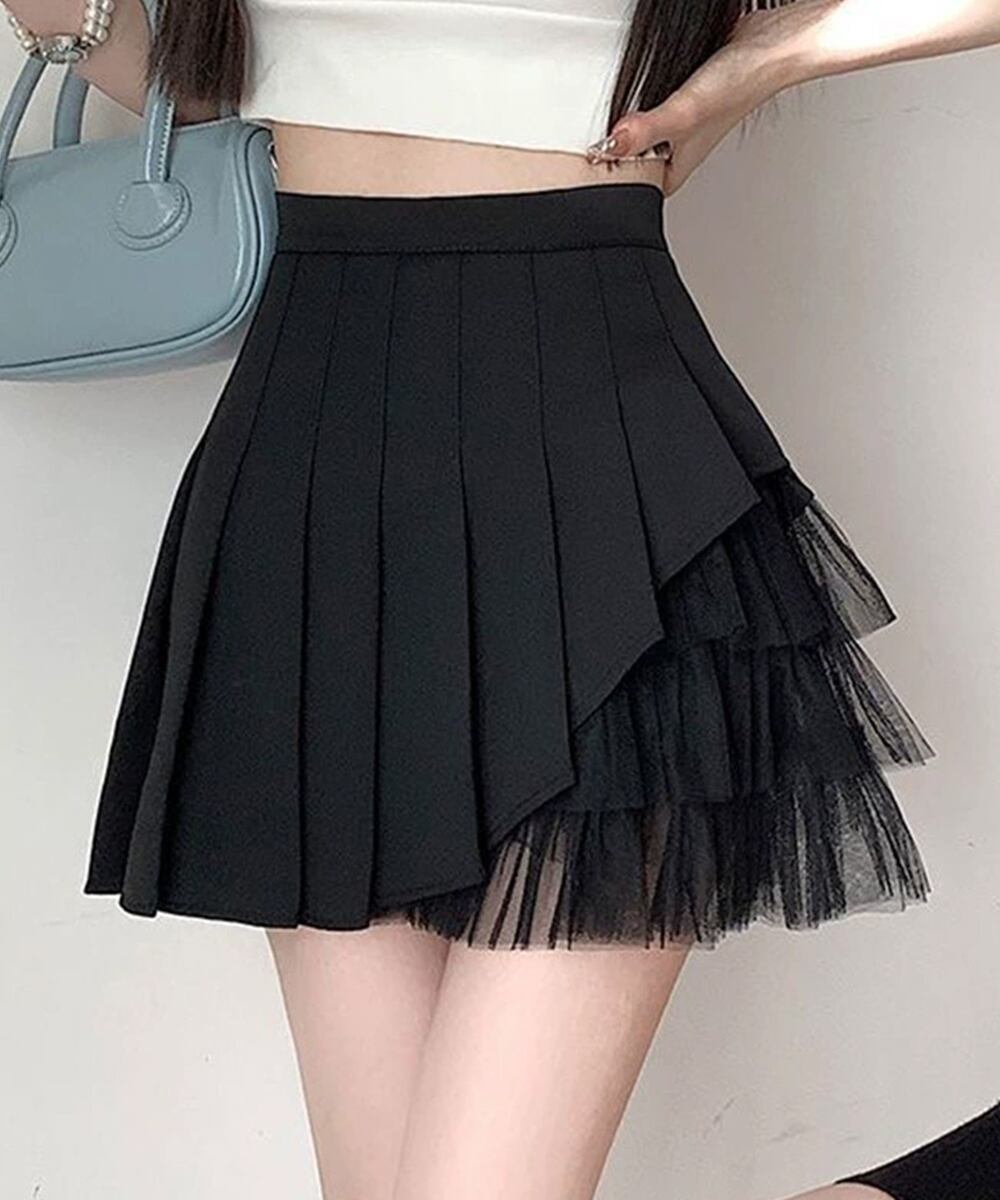 プリーツと透け感のあるチュールを組み合わせた、レイヤードデザインのハイウエストミニスカート。