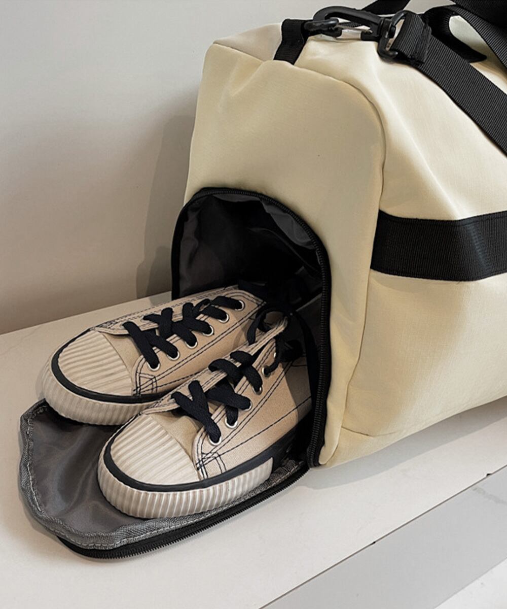 シューズ収納スペース付きで、靴や濡れ物をメイン収納と分けて持ち運べる。