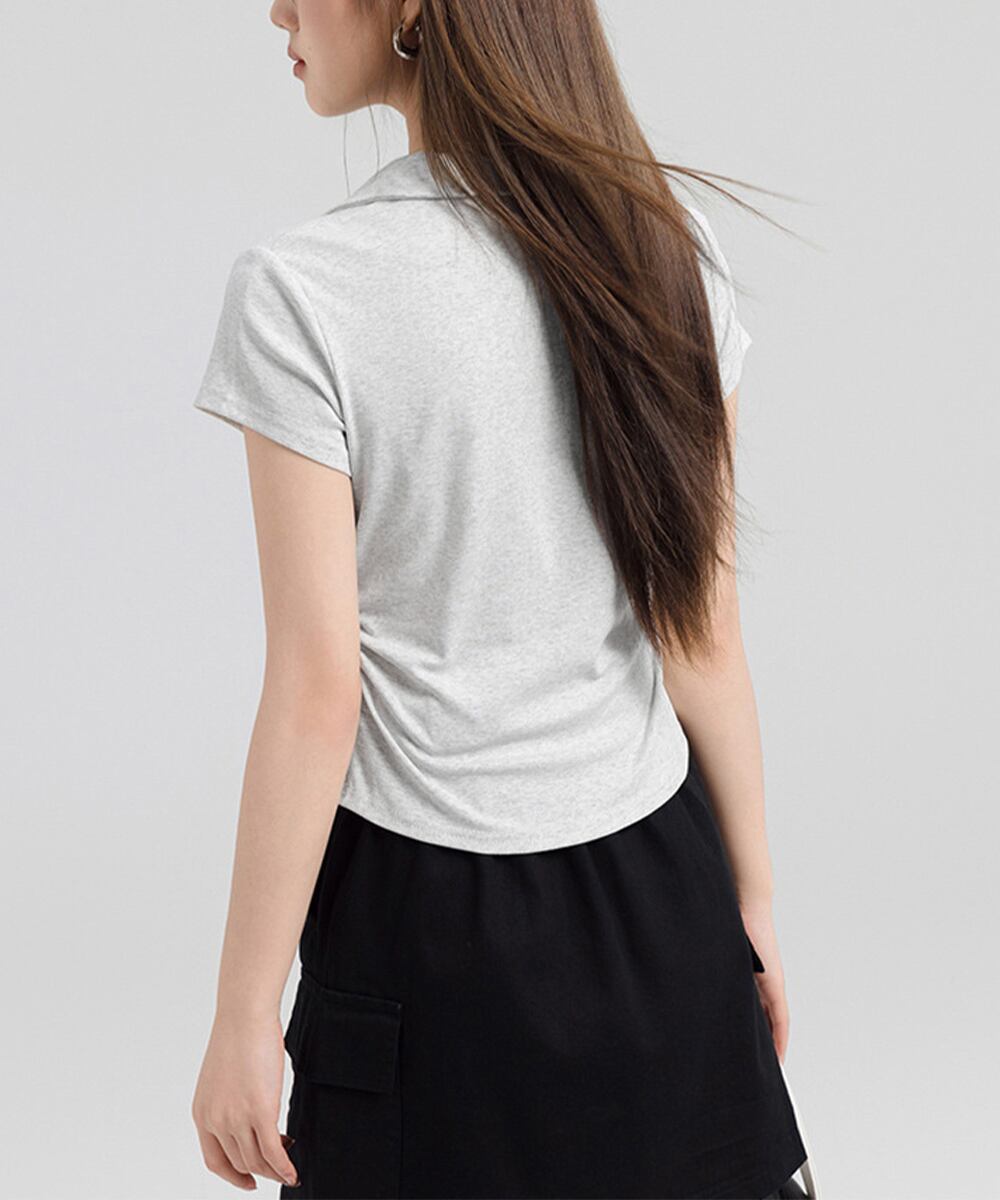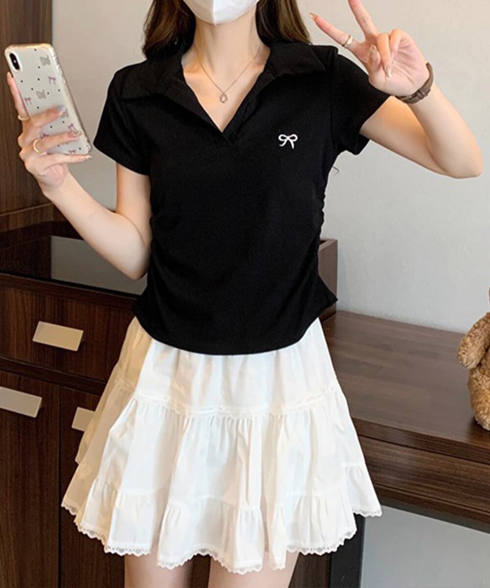 ポロカットソー細身 タイトTシャツ黒白 Y2Kコーデ 夏服