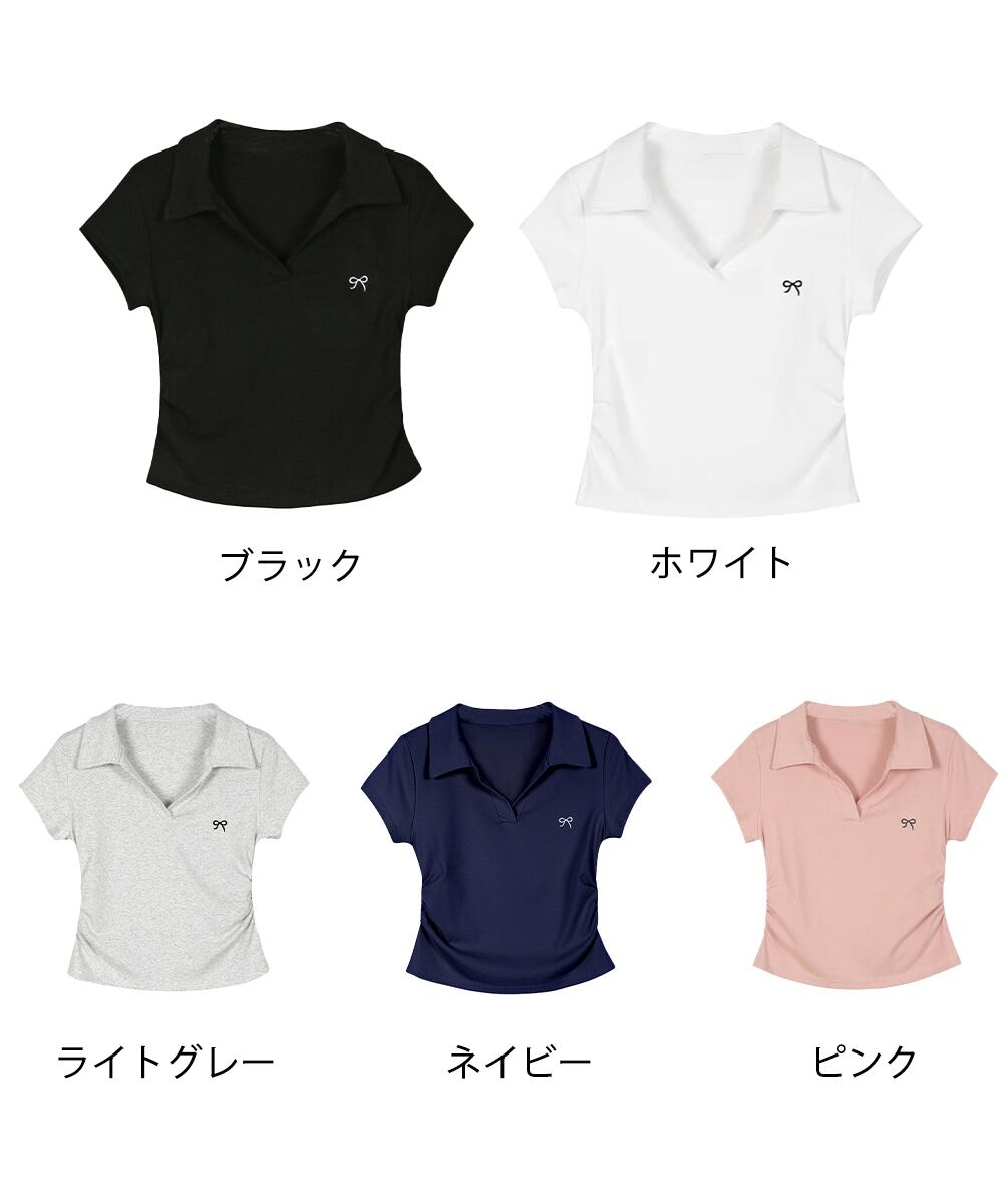 サイドシャーリング 半袖トップス 襟付きtシャツ 無地ダンス衣装 韓国風 胸元にワンポイント カットソー 着やせ ポロT