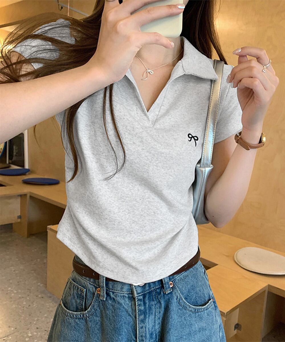 清楚感あふれるVネックリボン刺繍入りポロシャツ。