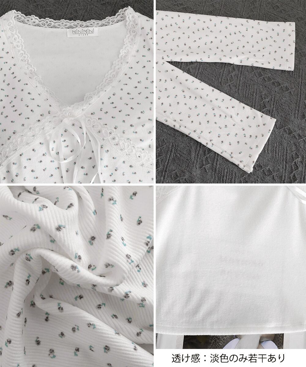 ショート丈インナートップス 小花柄と無地 リブTシャツ おしゃれ 細見えトップス 可愛い肌着 レースリボントップス 春秋