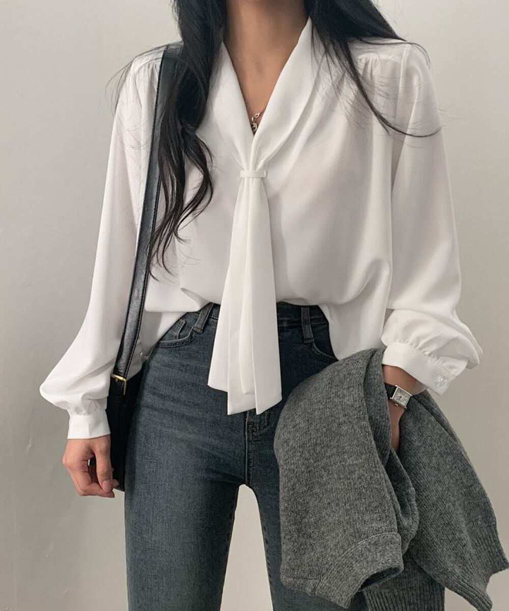 無駄のないシンプルなタイネックブラウス。