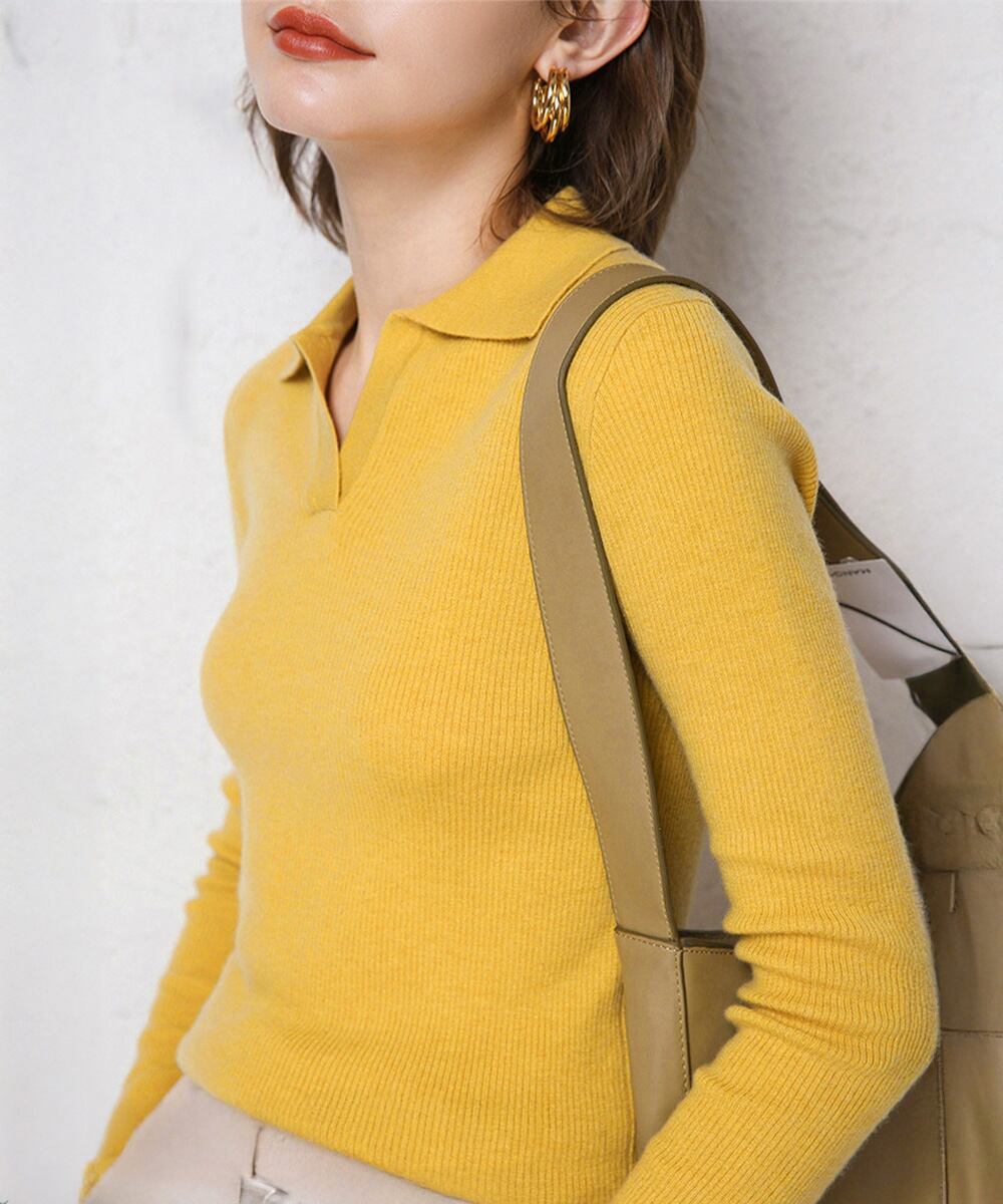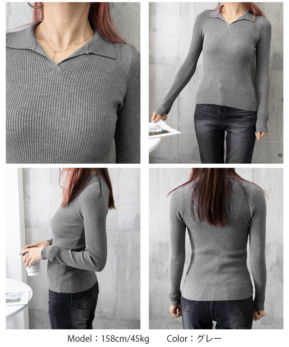 毎日のコーデに取り入れやすい、Vネック×襟付きデザインのベーシックなリブニットトップス。