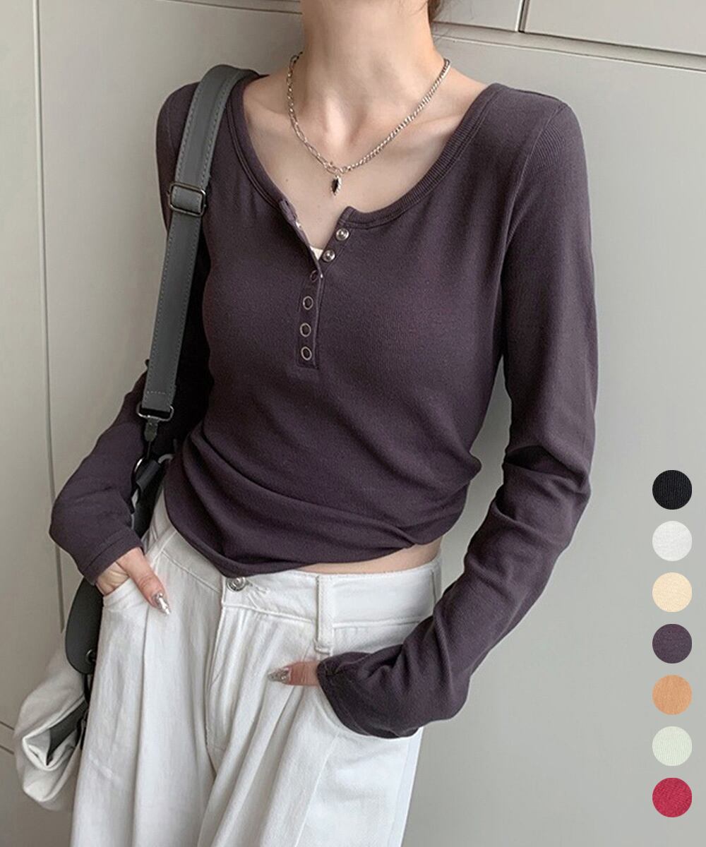 ヘンリーネックデザインのリブ編み長袖カットソー。