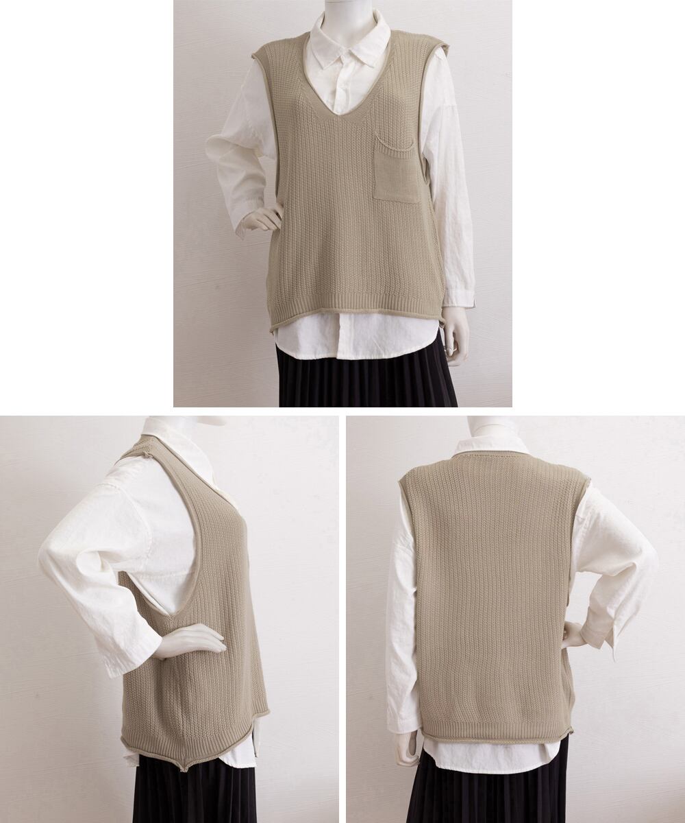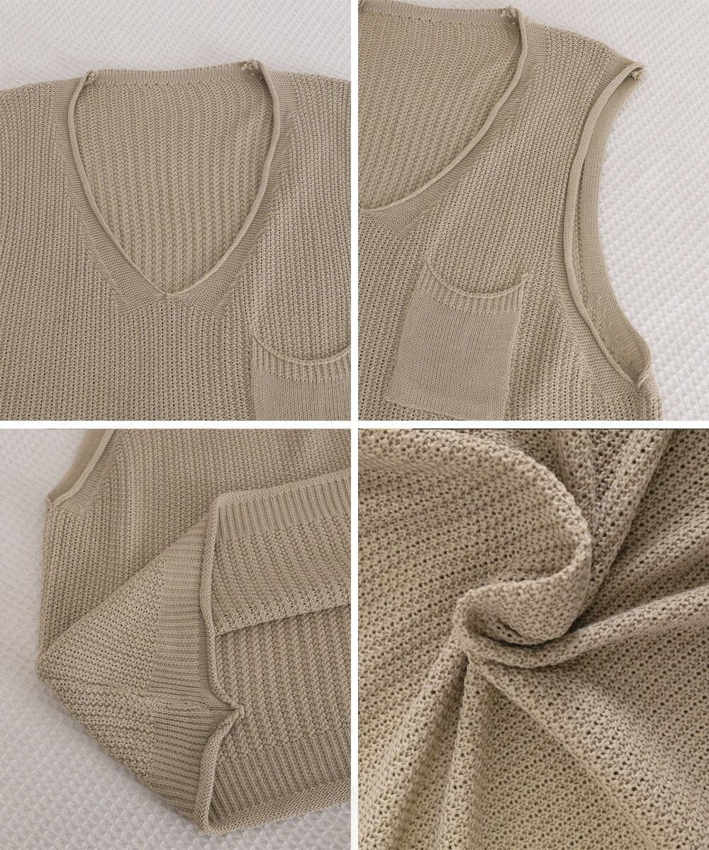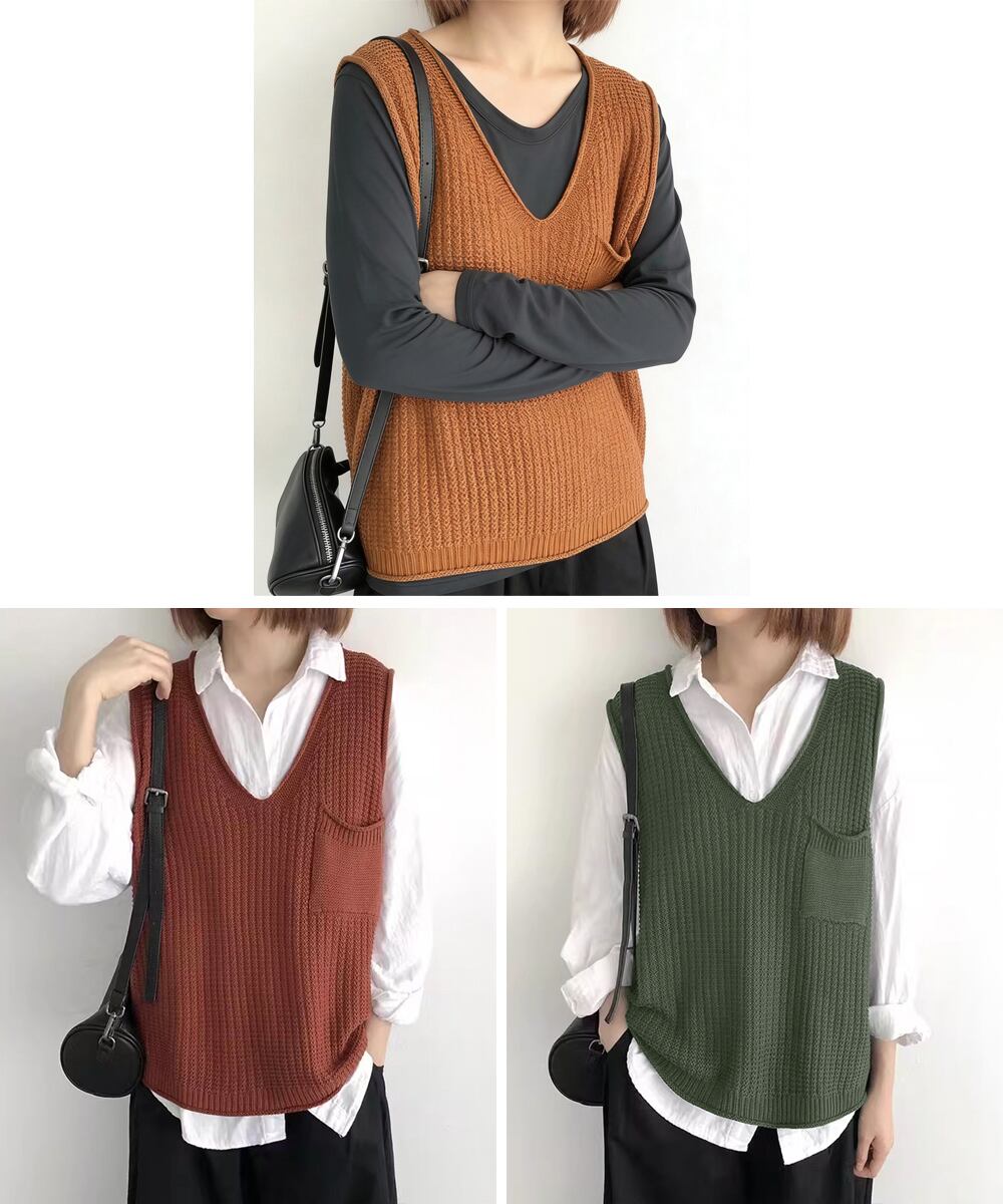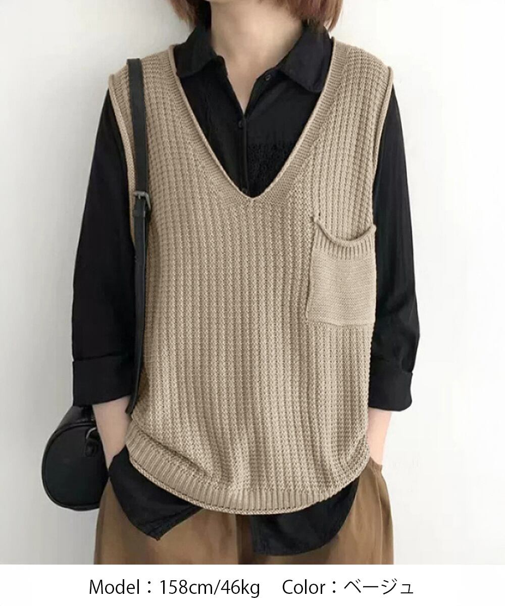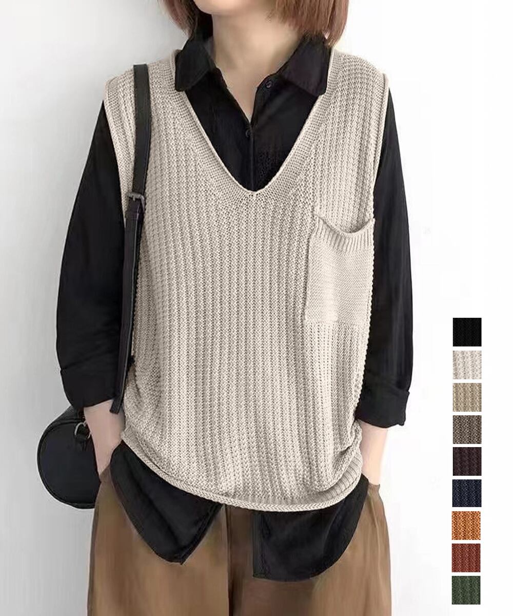 ポケット付きニットジレ ノースリーブ ニットトップス 重ね着 ベストセーター 薄手 体型カバー 20代30代