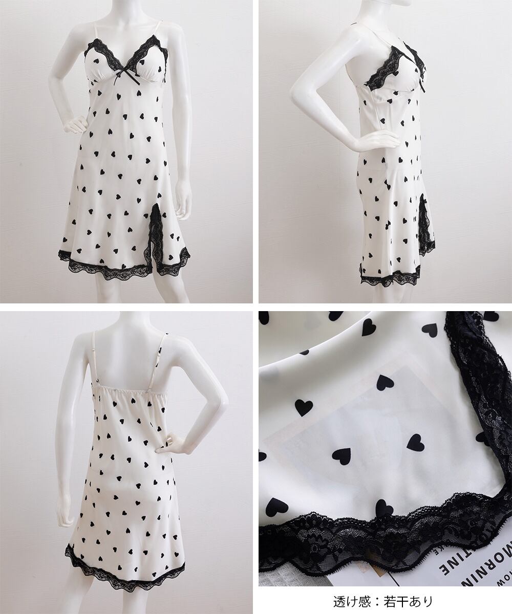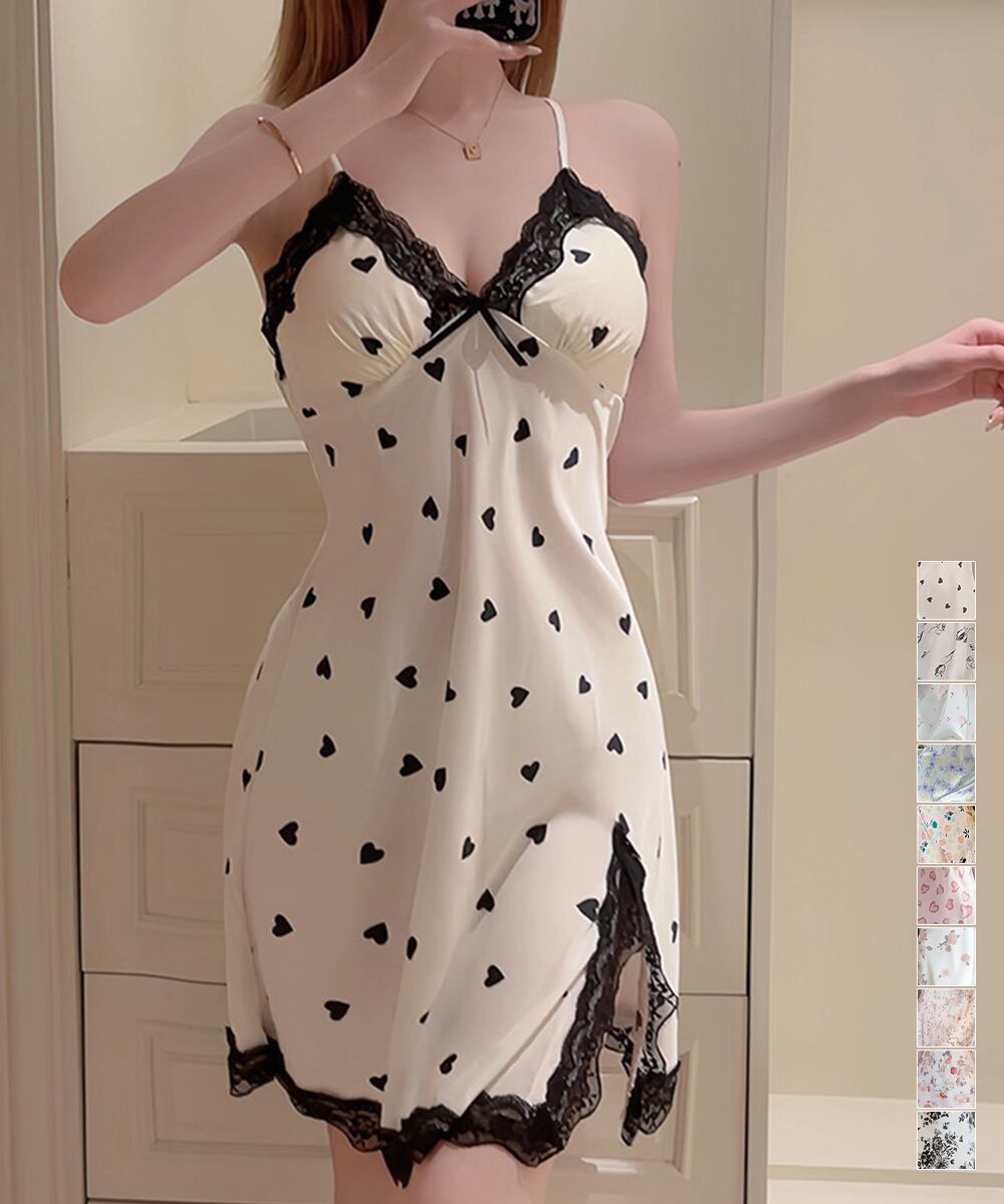 ルームウェア レディース 滑らか セクシー花柄キャミワンピ 体型カバー レース切り替え ハート柄 Vネック スリット入り