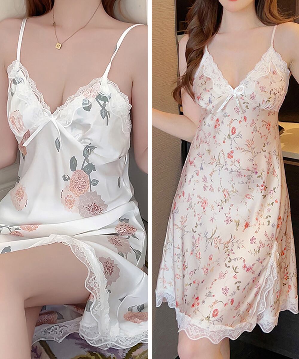 豊富な柄バリエーションと、レーストリムをあしらったサテン調キャミワンピース。