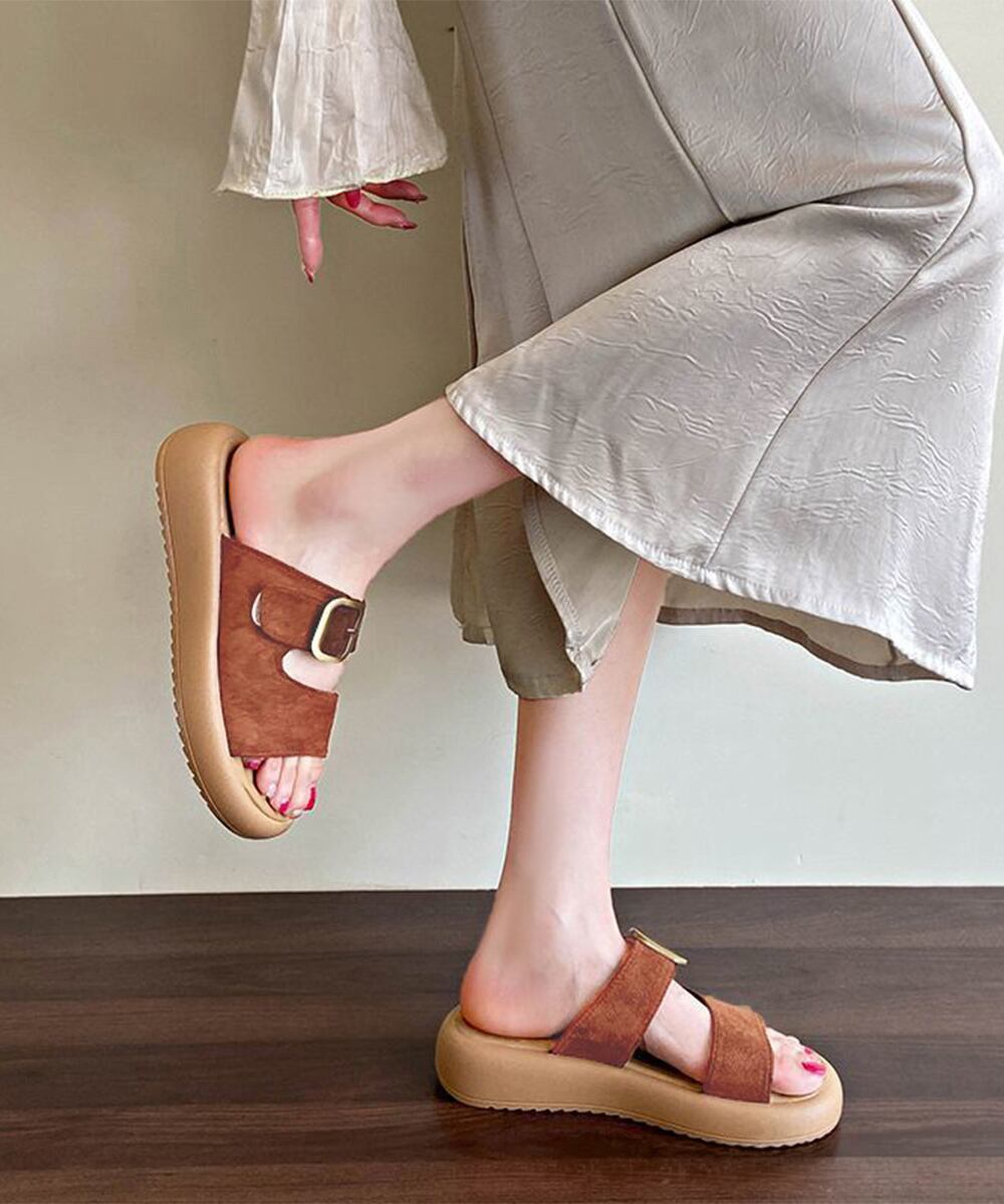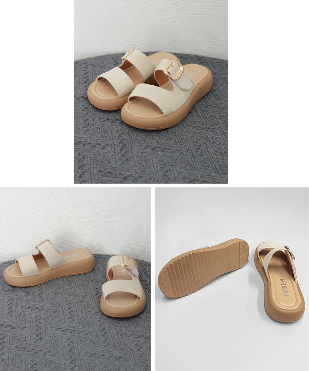 ゴールドバックルがアクセントになった、シンプルなデザインの厚底サンダル。
